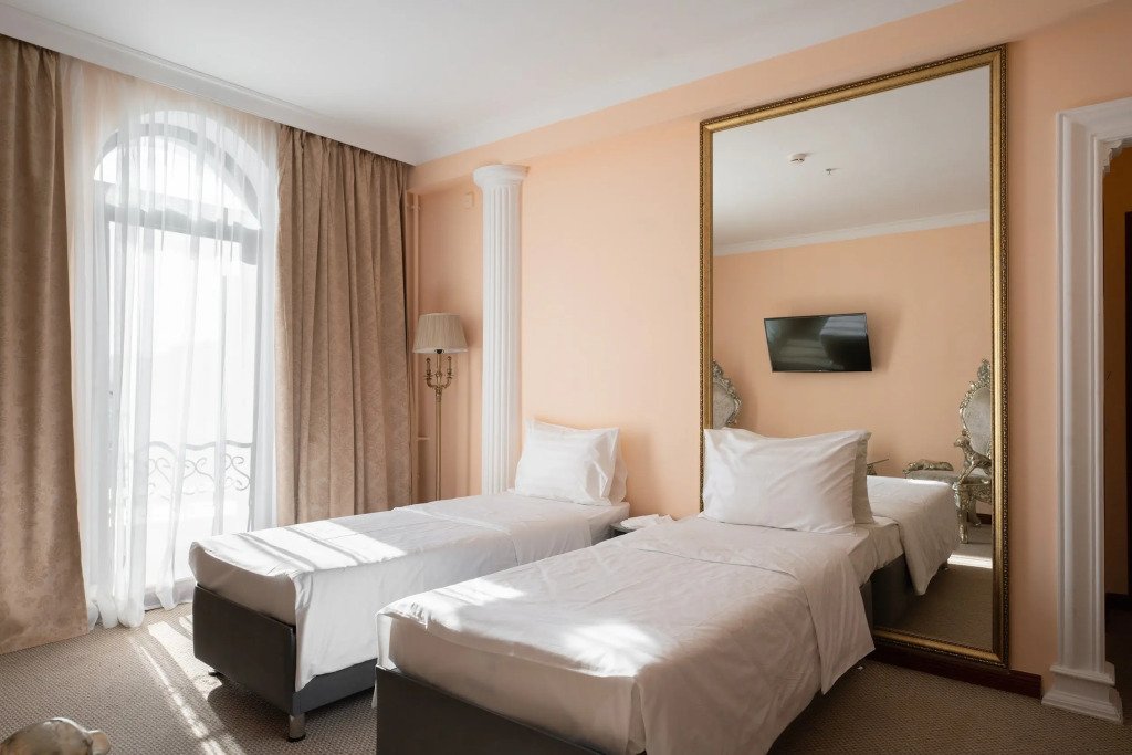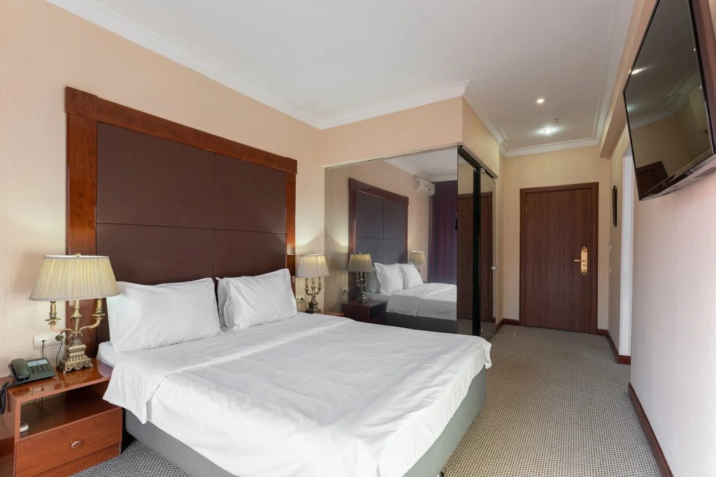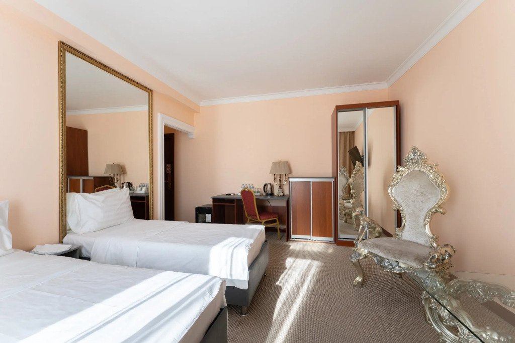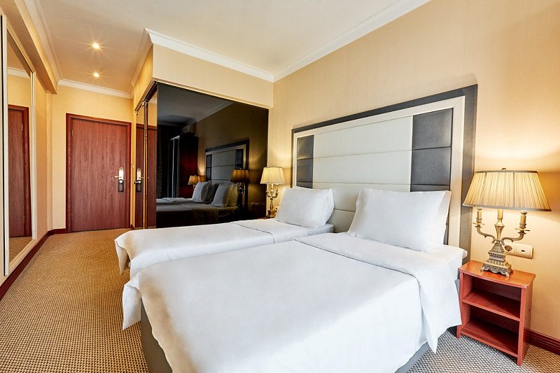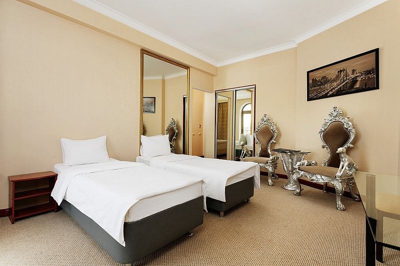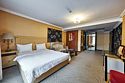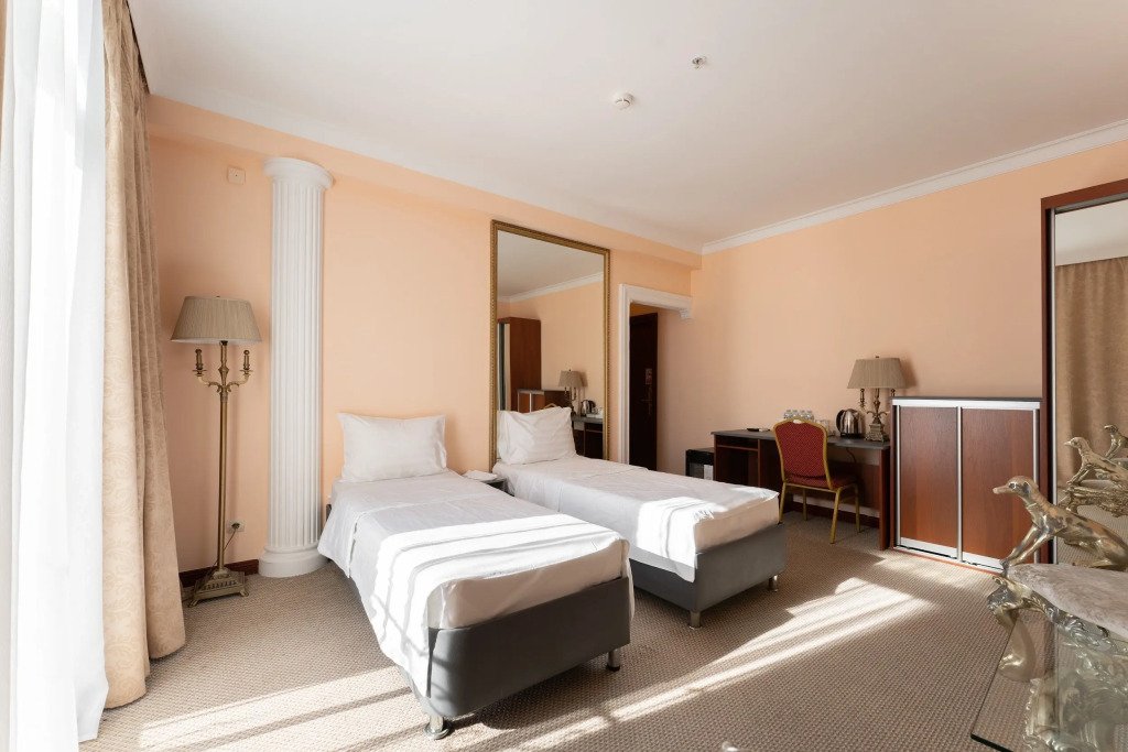 Интерьер выдержан в приятной теплой гамме, которая располагает к спокойному отдыху после насыщенного дня. Две Широкие двухместные кровати размера «King Size» снабжены ортопедическим матрасом, который гарантирует великолепный сон, а современная система климат-контроля обеспечит оптимальную температуру и максимальный уют в номере. В номере есть удобный письменный стол и высокоскоростной Wi-Fi, а также индивидуальный сейф для ценных вещей и документов.