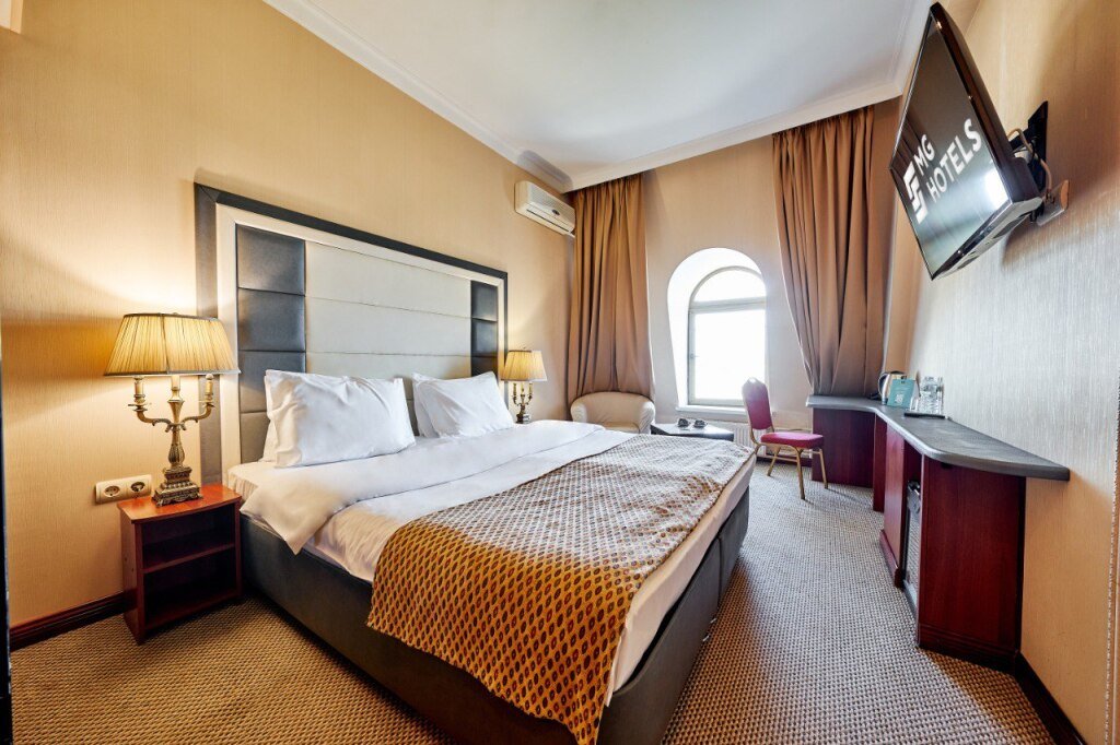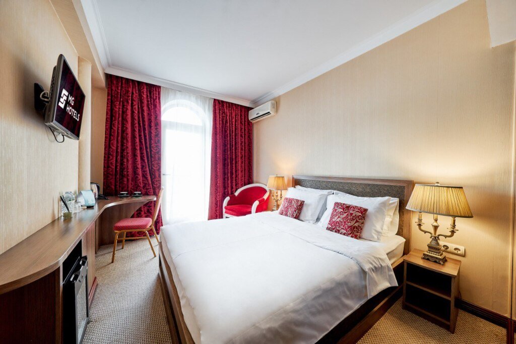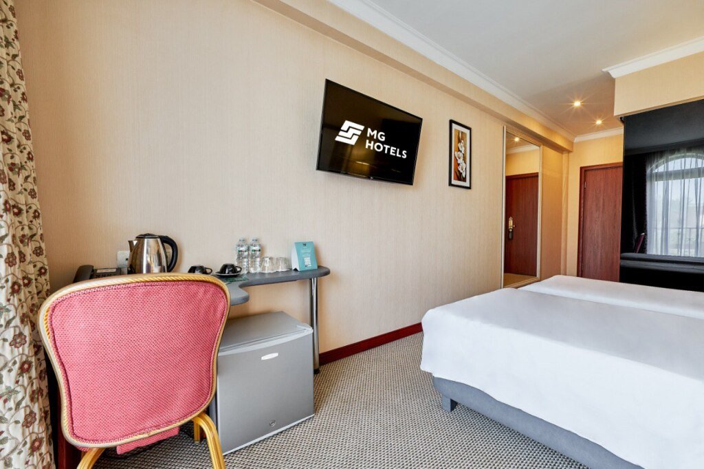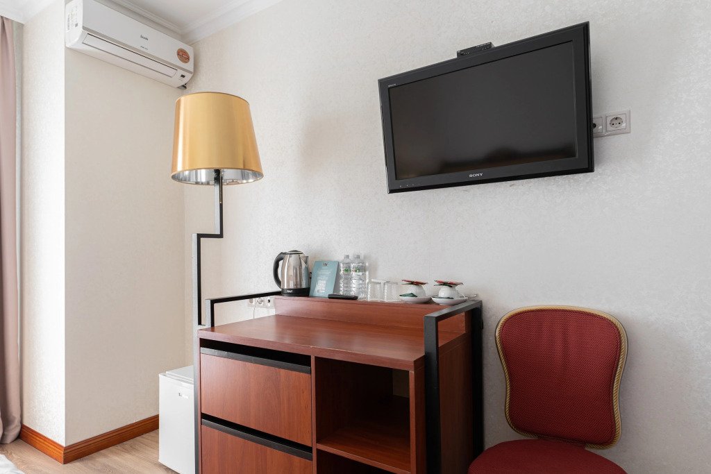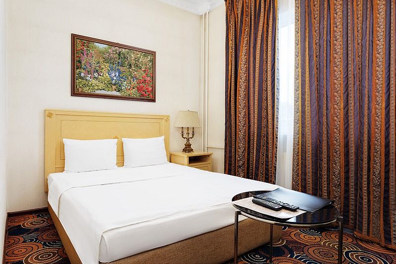 Двухместный номер категории «Стандарт» с одной двуспальной (160см*200см либо 180см*200см) прекрасный вариант для деловой поездки или отдыха пары. Небольшой, но очень комфортный номер отличается стильным интерьером в теплых тонах, которые лишь добавляют уюта, расслабляют и настраивают на отдых. Плазменная панель и доступ к интерактивному спутниковому телевидению разнообразят досуг.