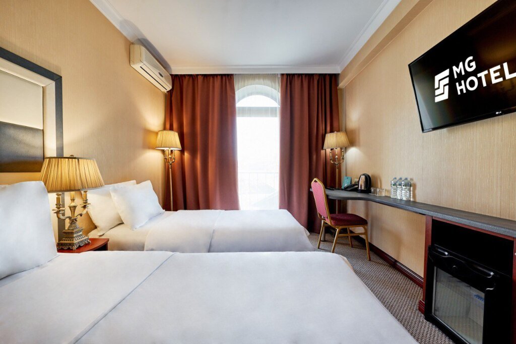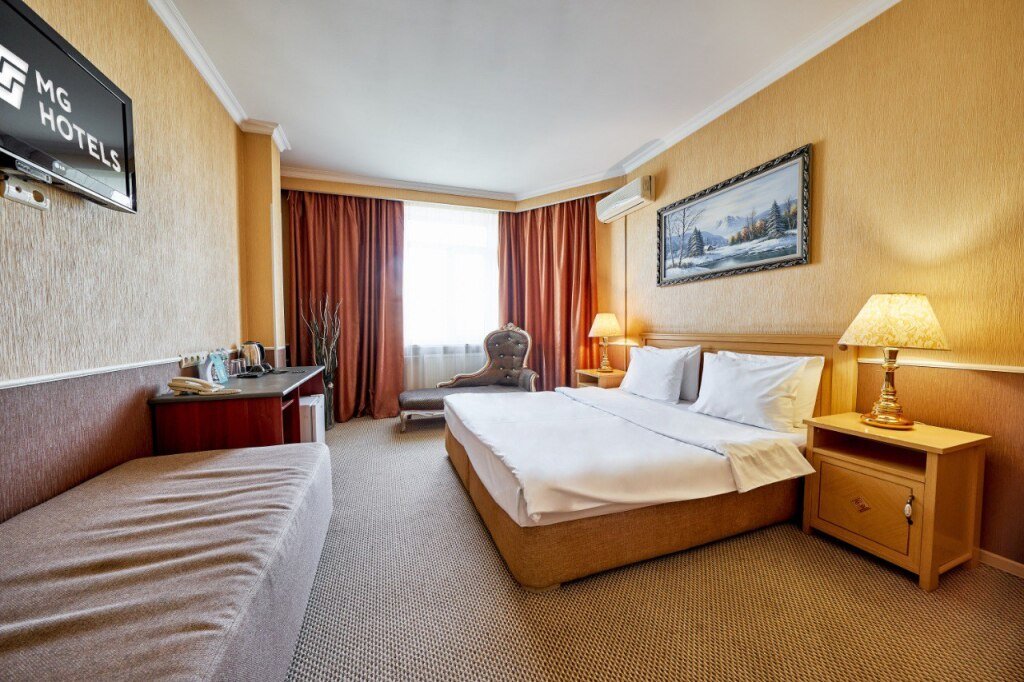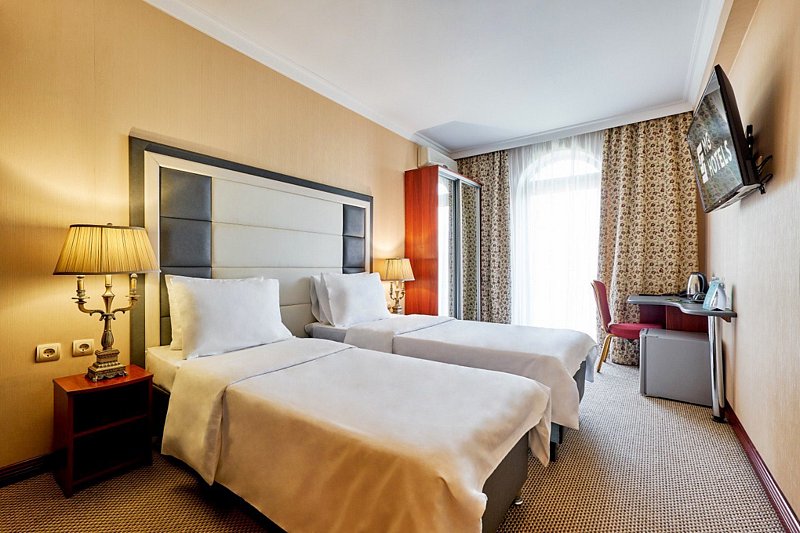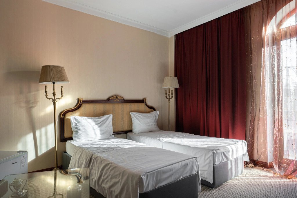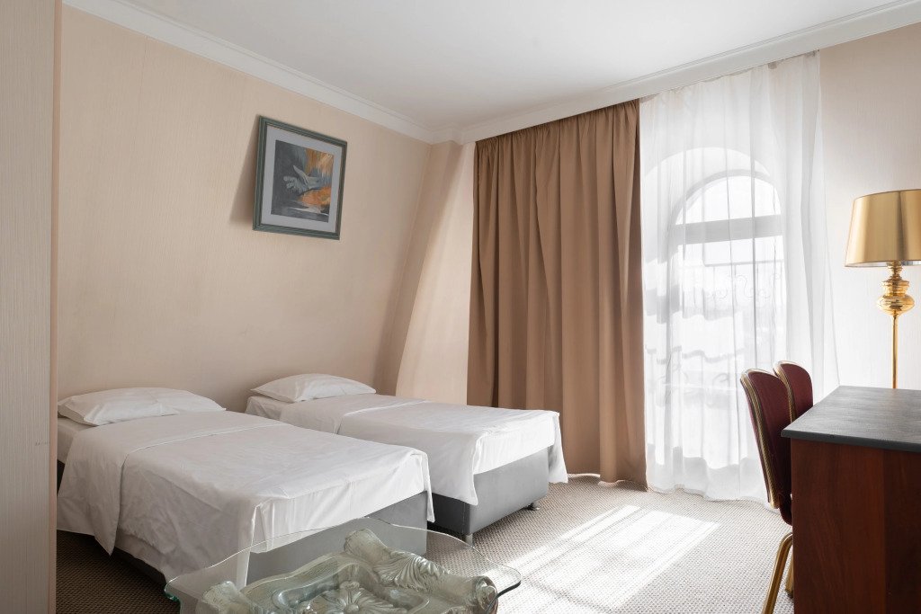Двухместный номер категории «Стандарт» с одной двуспальной (160см*200см либо 180см*200см) или двумя раздельными кроватями ( 90см*200см либо 120см*200см) — прекрасный вариант для деловой поездки или отдыха пары. Небольшой, но очень комфортный номер отличается стильным интерьером в теплых тонах, которые лишь добавляют уюта, расслабляют и настраивают на отдых.
