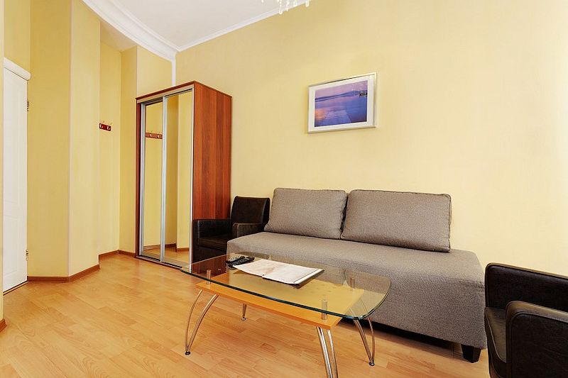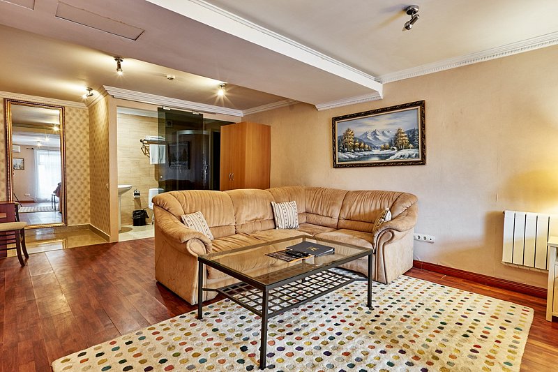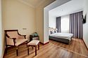 Просторный двухместный номер категории «Студио с балконом» – оптимальный вариант для романтического отдыха вдвоем или деловой поездки и встреч с партнерами. Интерьер номера тщательно продуман — теплые оттенки, в которых он выдержан, расслабляют, а изысканная мебель из ценных пород дерева и натуральной кожи придает номеру солидность. Широкая двухместная кровать размера «King size» с ортопедическим матрацем гарантирует сладкий сон.