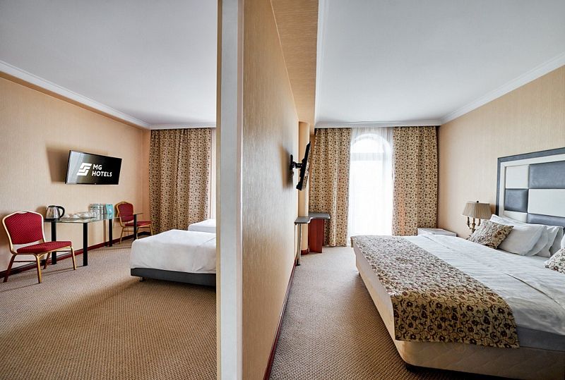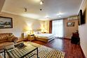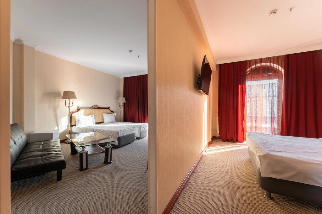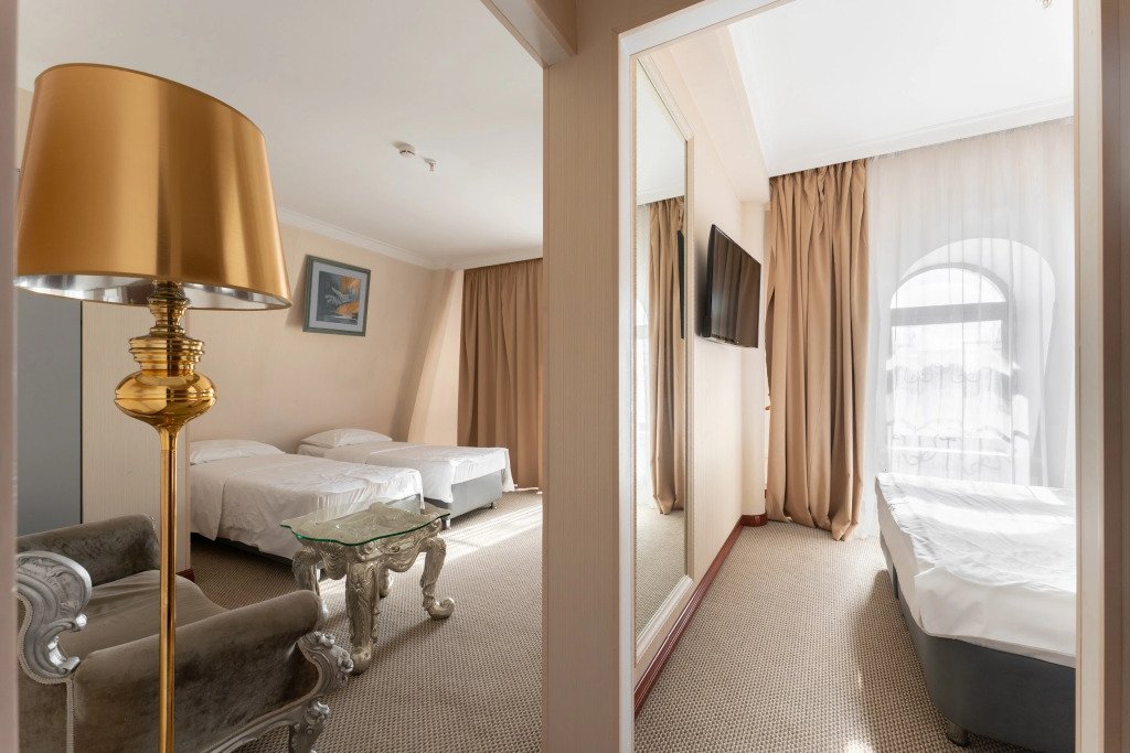 Номер категории «Четырехместный Люкс» — оптимальный выбор для солидных гостей, влюбленных пар и молодоженов. Просторный и комфортный, с тщательно продуманным интерьером — здесь есть все, что может понадобиться вам во время отдыха.