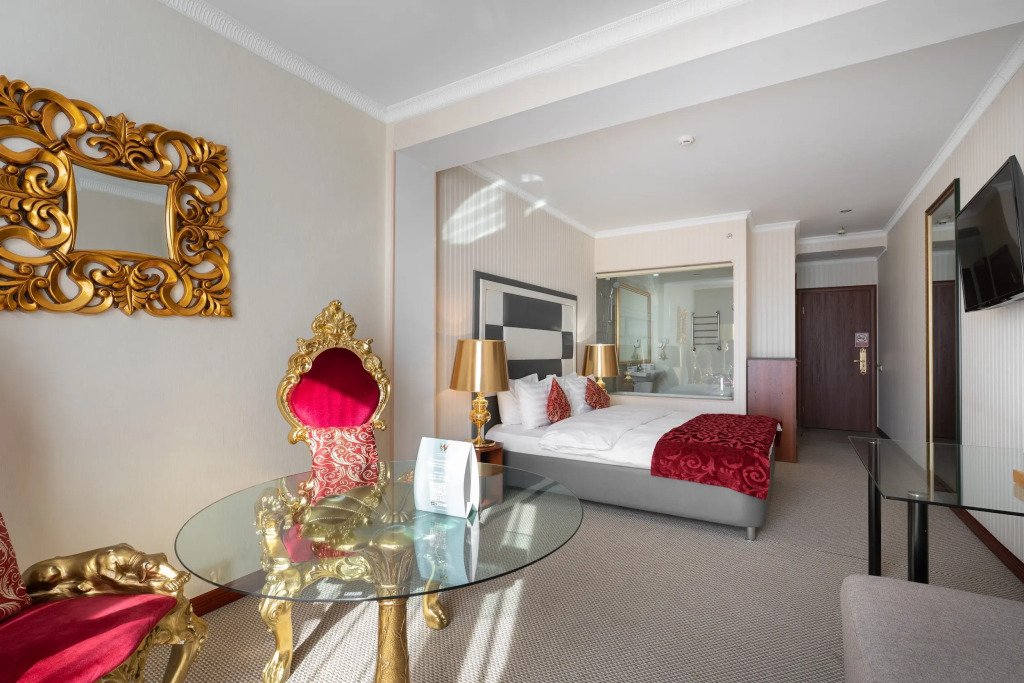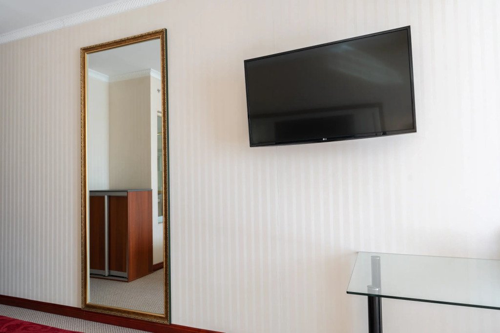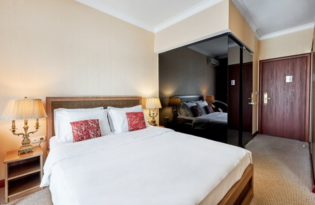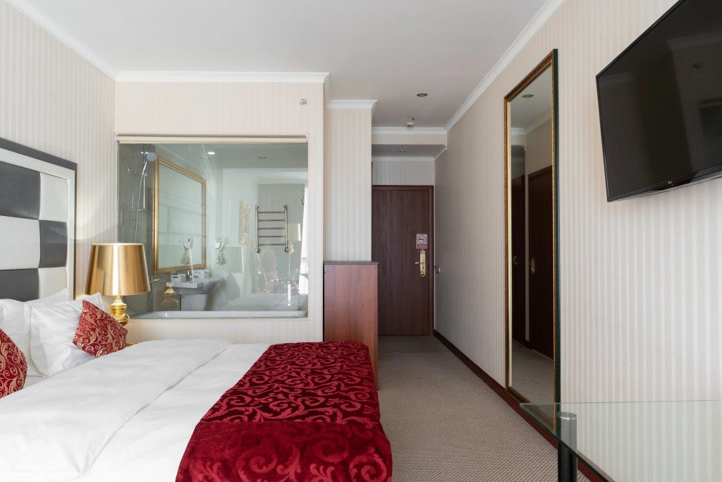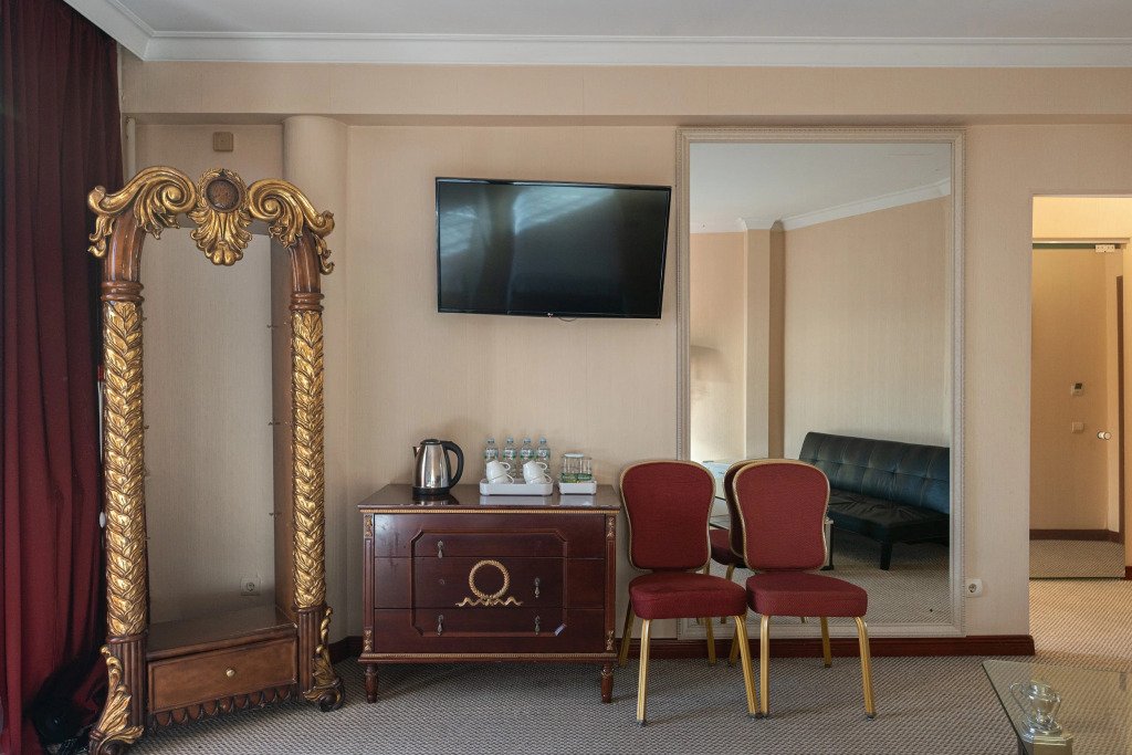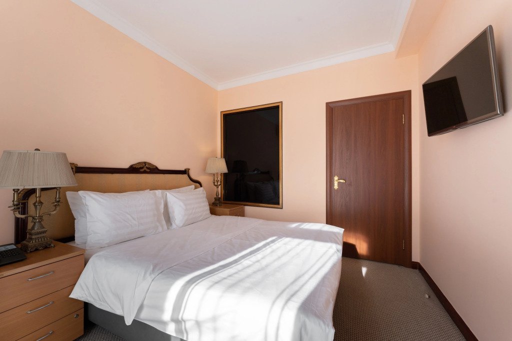 Широкая двухместная кровать размера «King size» с ортопедическим матрацем гарантирует сладкий сон. Ценные вещи и документы можно оставить в сейфе. Номера укомплектованы мини-баром, чайной станцией, телефоном, феном, гладильными принадлежностями и халатами.