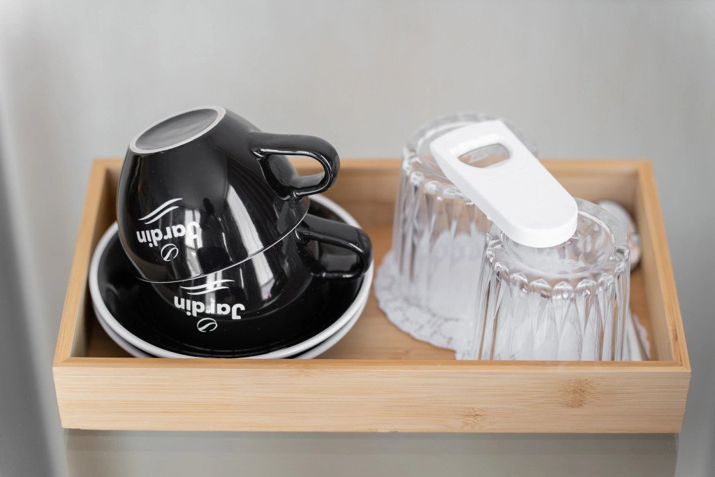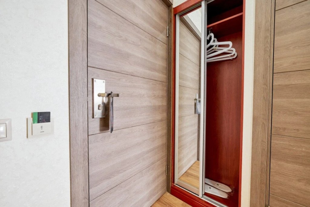 Дизайн прост и лаконичен, но благодаря ему небольшое по площади помещение выглядит просторным и светлым. Ценные вещи и документы можно оставить в сейфе. Номера укомплектованы мини-баром, чайной станцией, телефоном, феном, гладильными принадлежностями и халатами. Ежедневно при жилой уборке происходит пополнение гигиенических принадлежностей, питьевой воды.