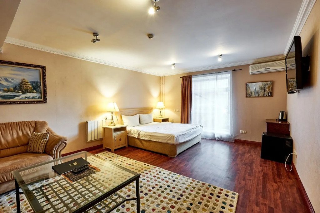 Просторный двухместный номер категории «Студио» — оптимальный вариант для романтического отдыха вдвоем или деловой поездки и встреч с партнерами. Интерьер номера тщательно продуман — теплые оттенки, в которых он выдержан, расслабляют, а изысканная мебель из ценных пород дерева и натуральной кожи придает номеру солидность.