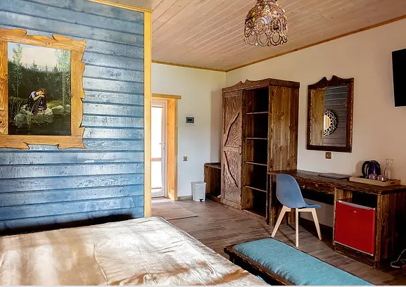 Гости размещаются в домиках для гостей. Два коттеджа имеют по три спальных помещения, зону для кухни со всем необходимым оборудованием, душ, туалет. В деревянной избе на 4 человека есть печь, умывальник. Туалет на улице. Гостям предлагается посетить баню, воспользоваться услугами фермерского магазина с экологически чистой продукцией. Можно воспользоваться предложениями хозяев по организации завтраков, обедов, ужина.