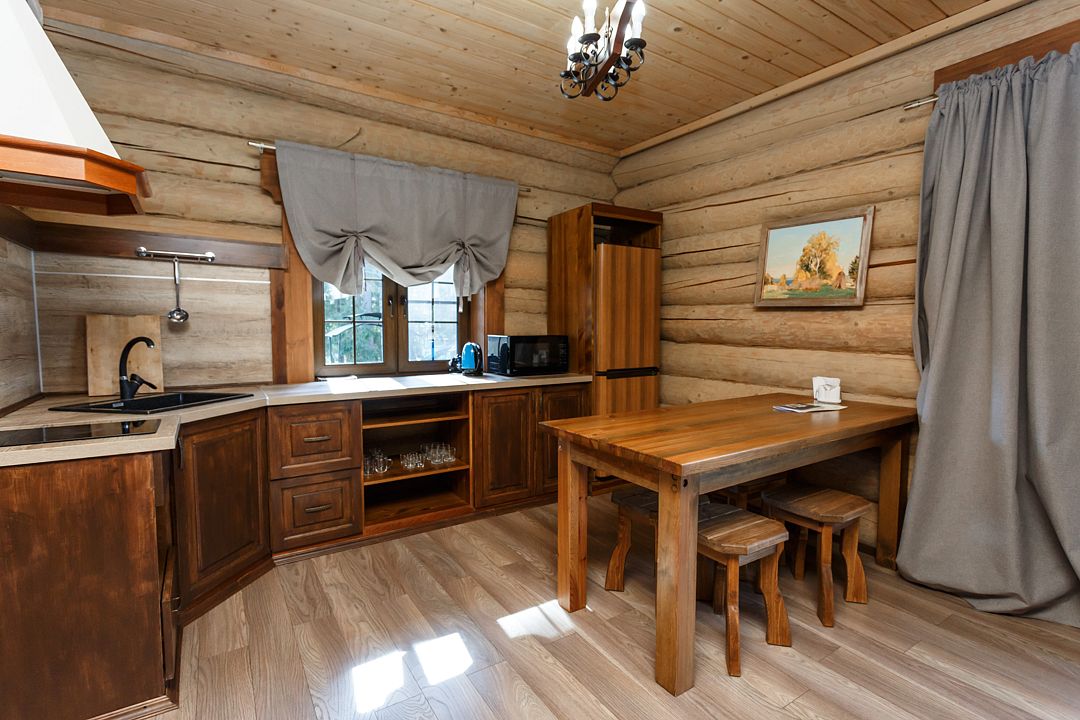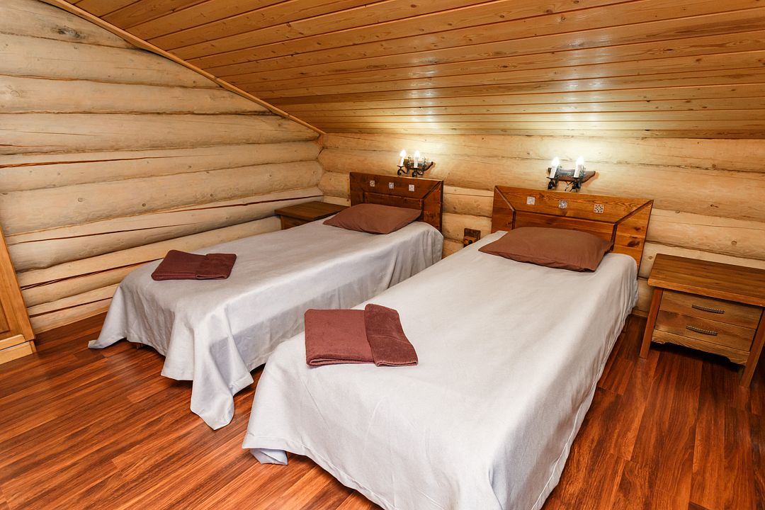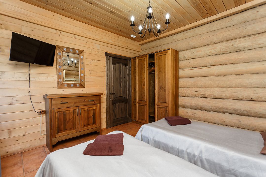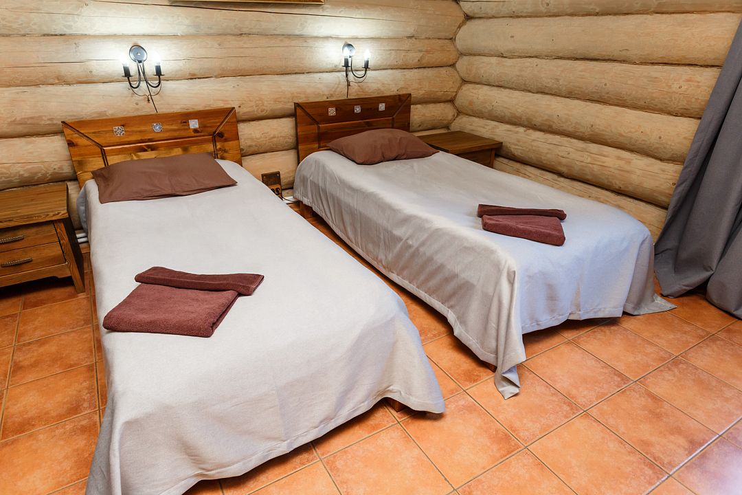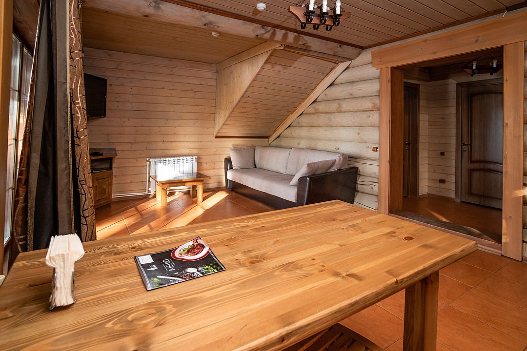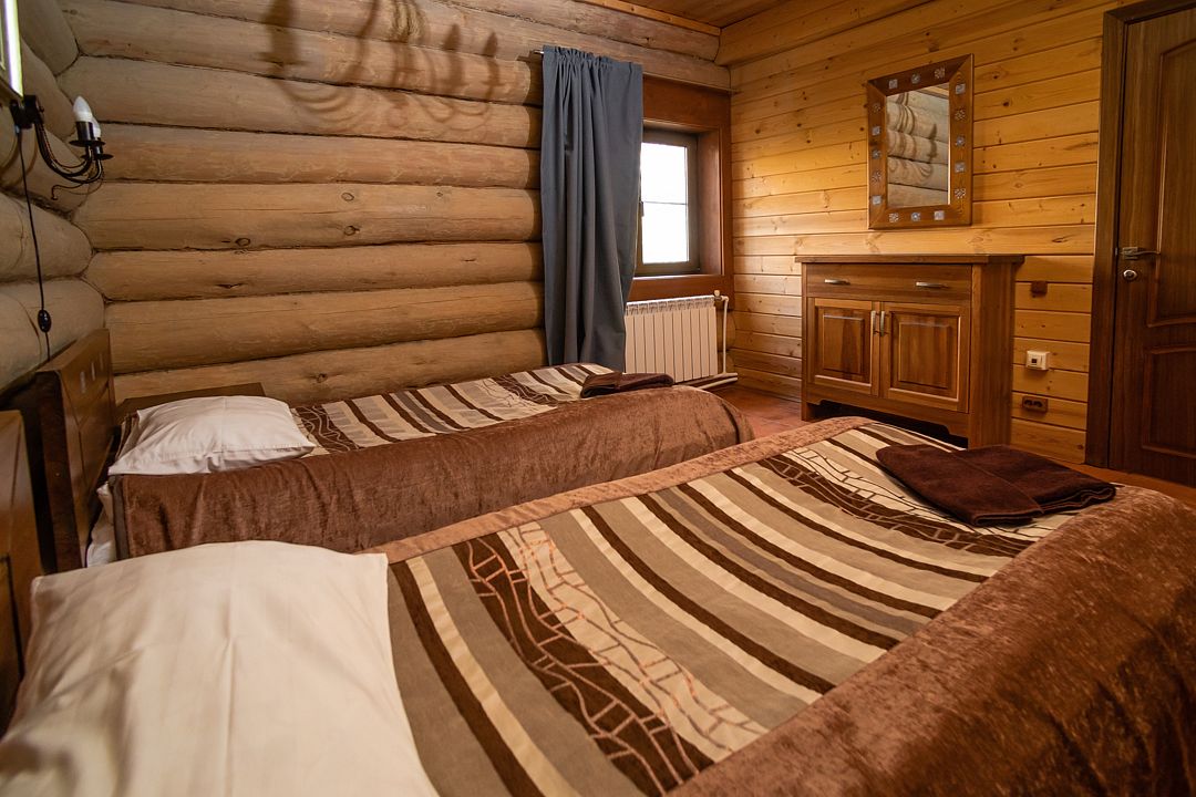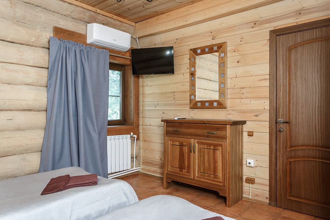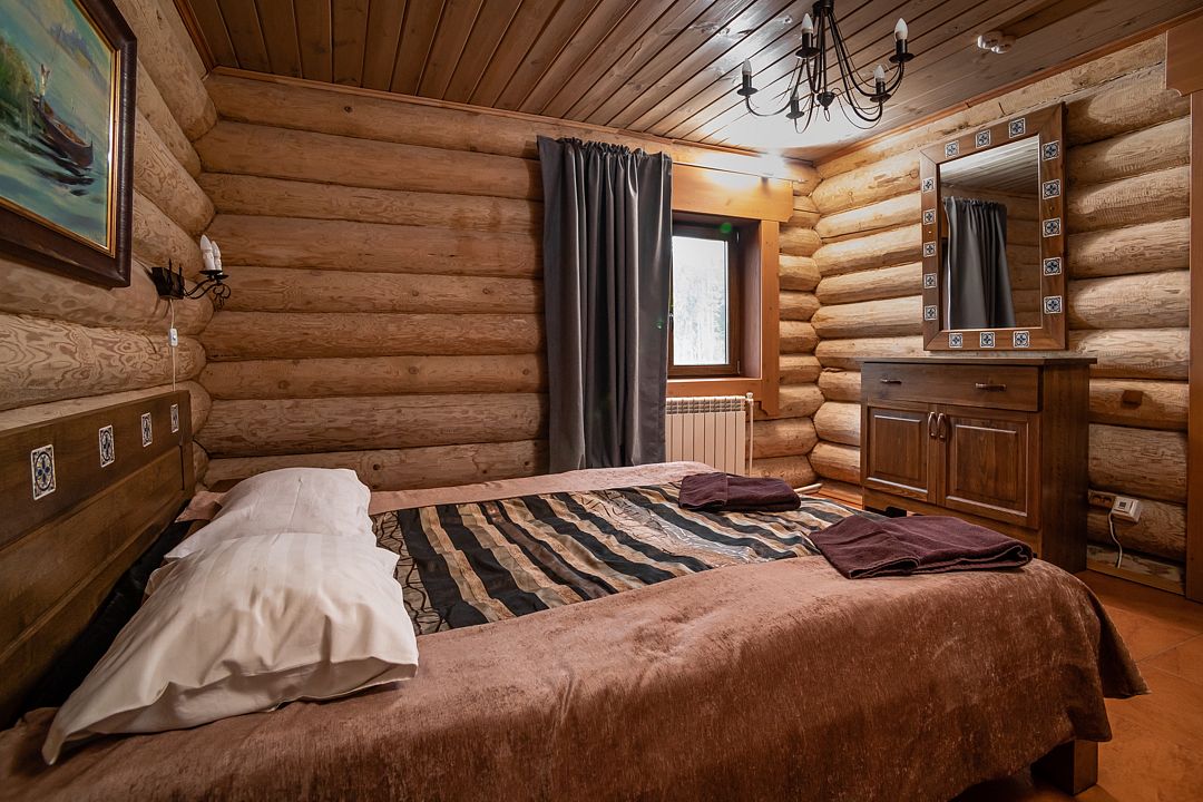 коттедж - уютный рубленый деревянный дом с авторской мебелью ручной работы, выполненный полностью из экологически чистых материалов, первый этаж: прихожая, холл, санузел, спальня, большая кухня-гостиная; второй этаж: холл с двумя раскладными креслами, спальня, санузел. В 2024 году введена в эксплуатацию обновлённая категория номеров – ВИП Апартаменты. От обычных апартаментов они отличаются тем, что в них только недавно закончены ремонтные работы, обновлена сантехника, в каждой комнате установлены телевизоры со смарт ТВ, в комплектацию включена «умная колонка», установлен кондиционерУслуги и удобства