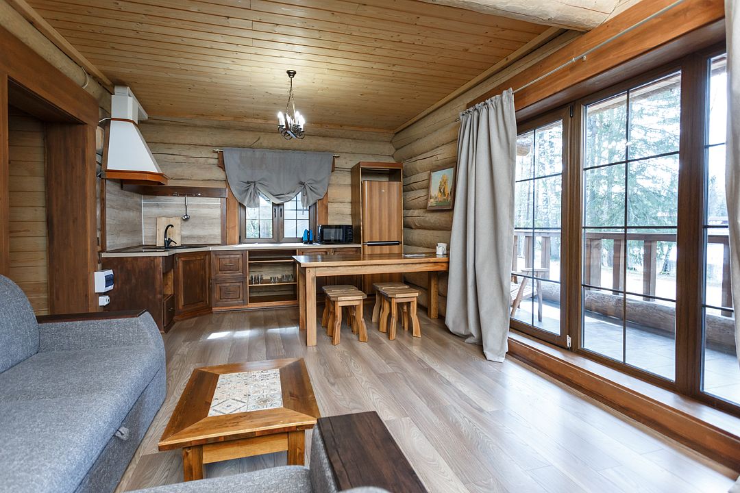 Отдельностоящий коттедж на 3 спальни— уютный рубленный деревянный дом с авторской мебелью ручной работы, выполненный полностью из экологически чистых материалов. Дом расположен на берегу озера.