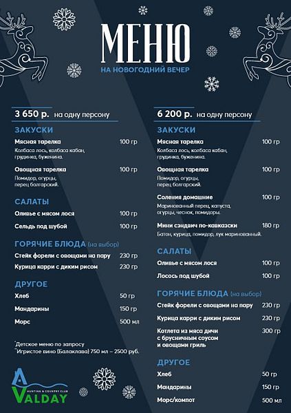 Барная карта тоже не отстаёт. Валдай Кантри Клаб может похвастаться 5-ю уникальными авторскими настойками, рецепт которых держится в строжайшем секрете вот уже несколько поколений, а также 8 разновидностей настоящего домашнего самогона.