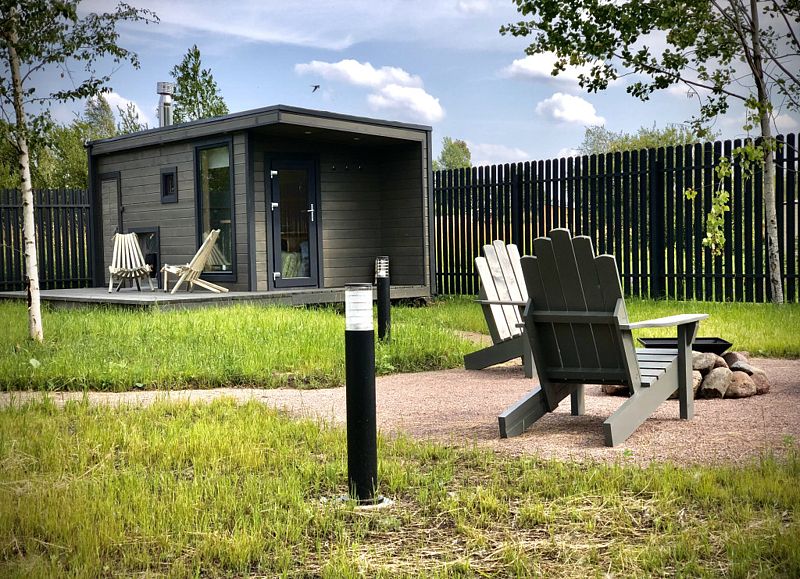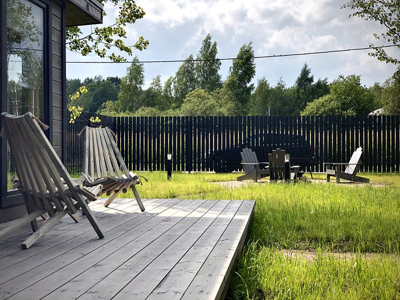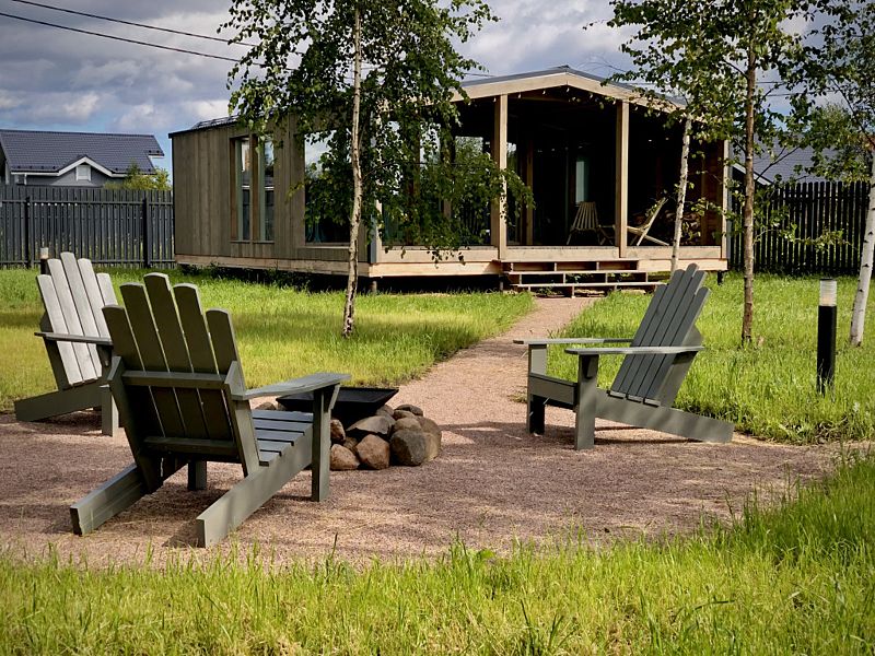 Рядом с домом уютная мангальная зона с мангалом, костровой чашей и удобными большими креслами. Среди услуг — русская баня на дровах.