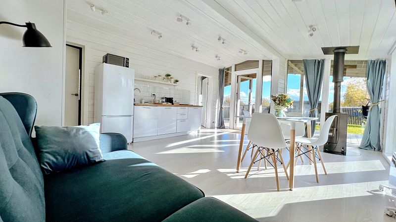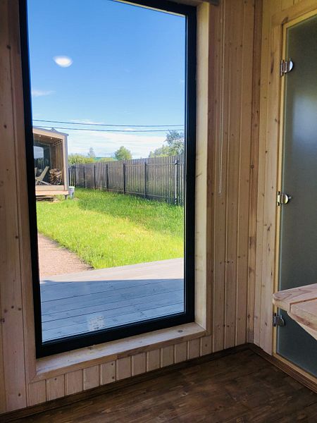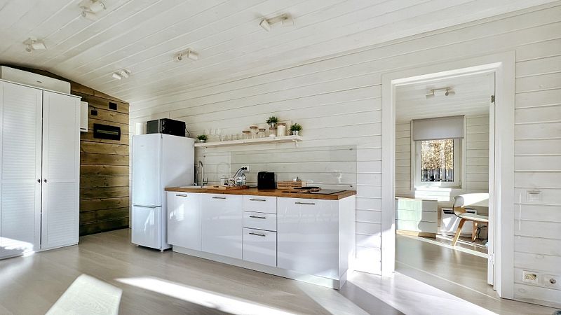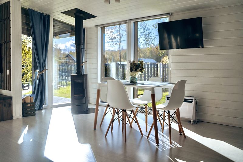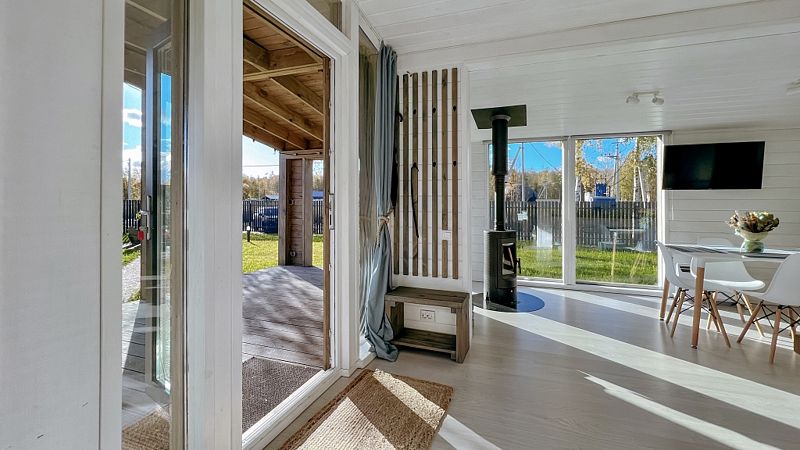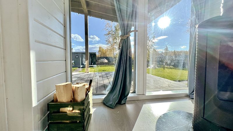 В номере есть телевизор с подключённым Смарт ТВ и подпиской на онлайн кинотеатр. Имеется встроенная кухня с необходимым для приготовления еды, дровяная печь-камин с панорамным стеклом, настольные игры.