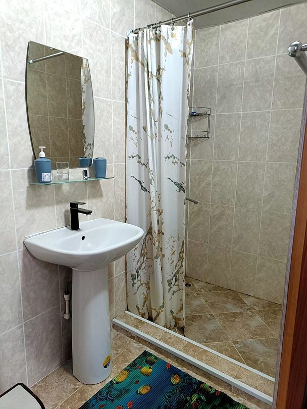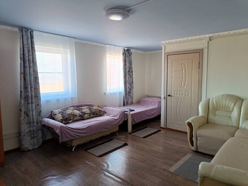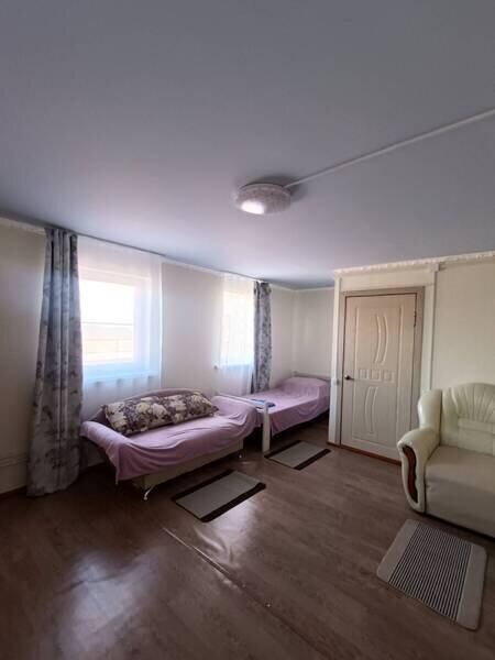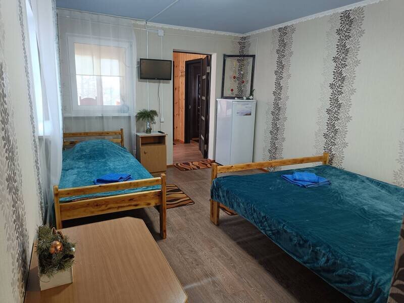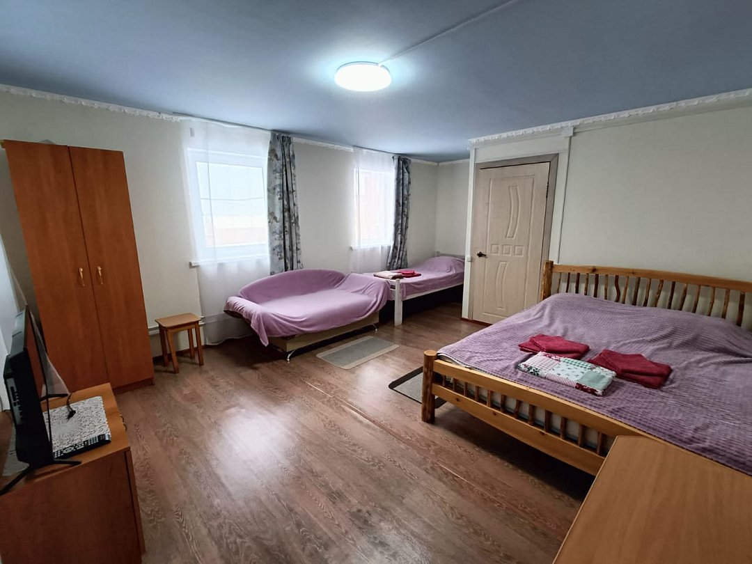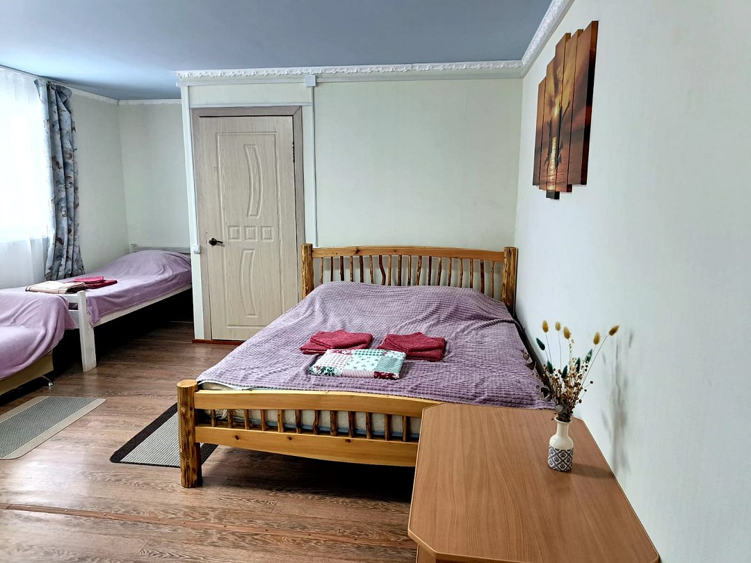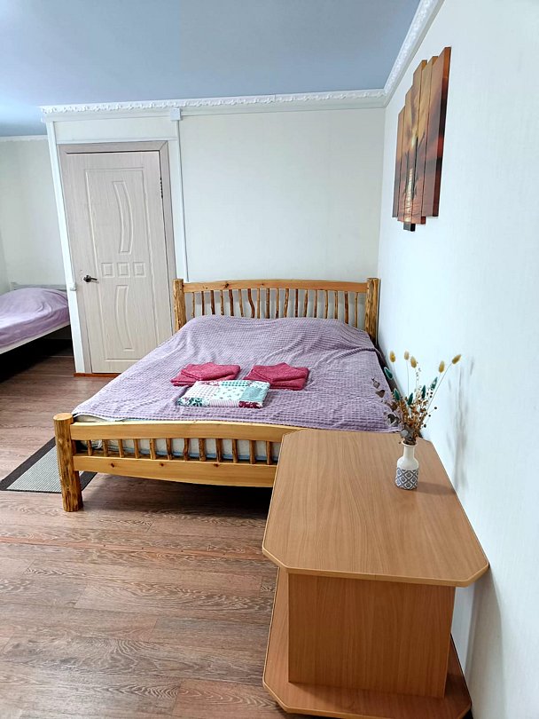 2 номера с отдельными входами. В одном номере имеется двуспальная кровать и 2 односпальные, в другом номере имеется двуспальная кровать и односпальная.