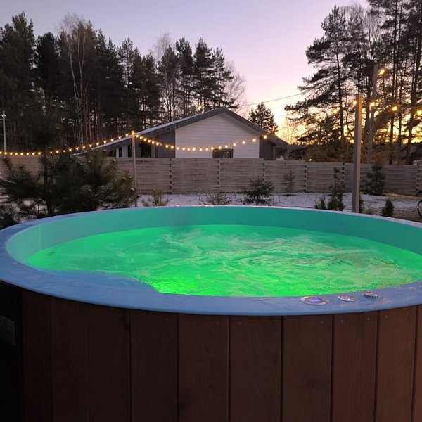 Вода в чане нагревается до комфортной температуры. Чан с гидромассажем и подсветкой. Необыкновенное удовольствие, окунувшись в теплый чан, любоваться ночным небом. Ритм жизни замедляется и появляется ощущение «здесь и сейчас».