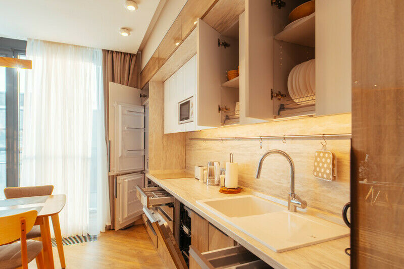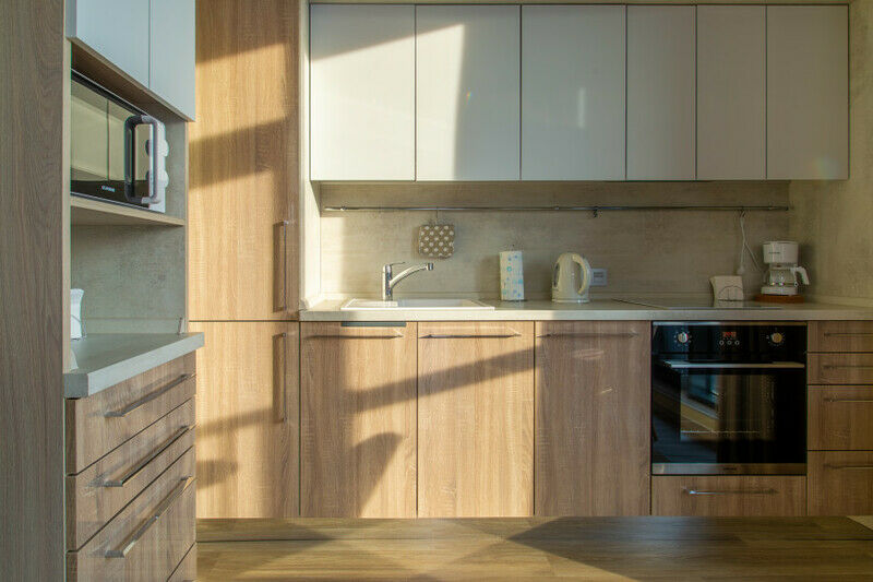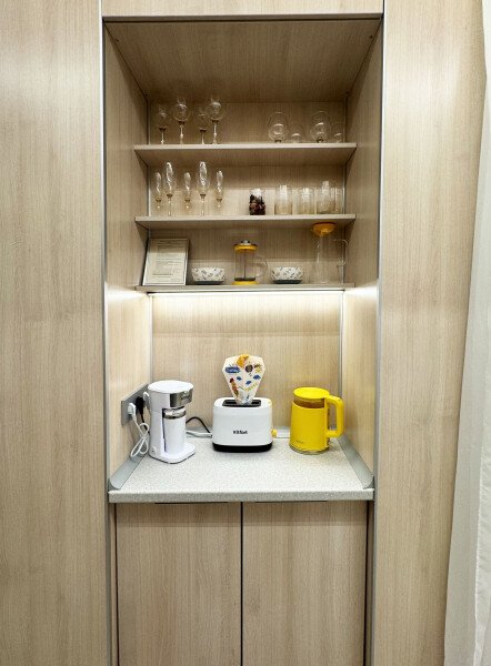 На кухне: варочная индукционная поверхность, духовка, двухкамерный холодильник, эл. чайник, кофеварка, микроволновка, посудомоечная машина