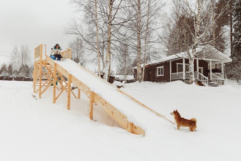 Для детей на территории дома есть батут, горка для тюбинга и ватрушки.