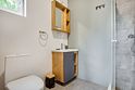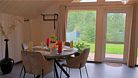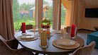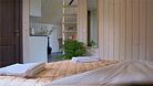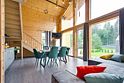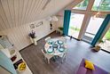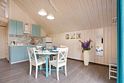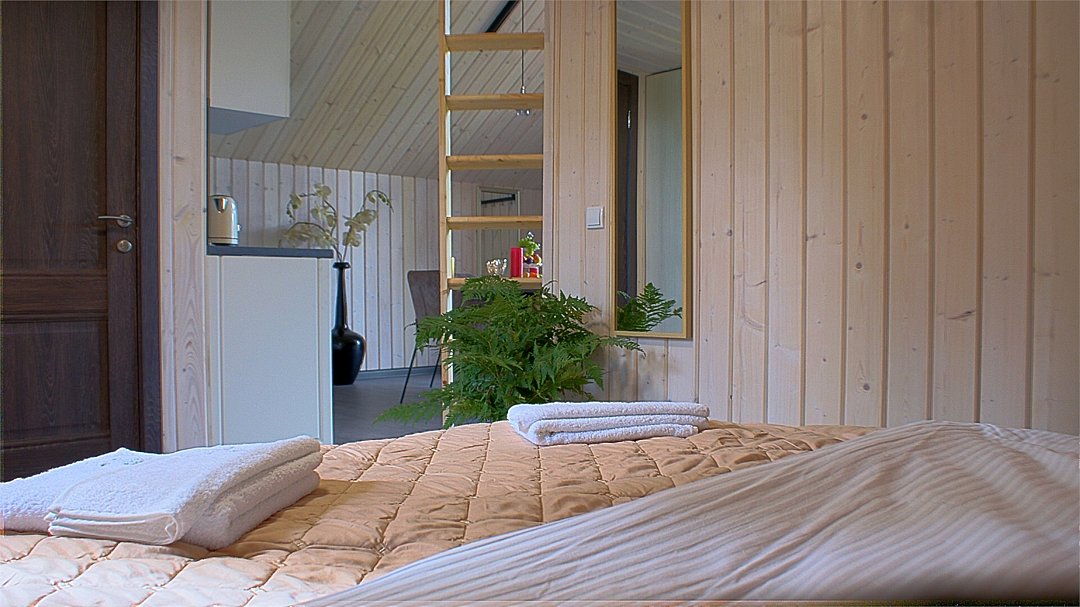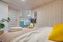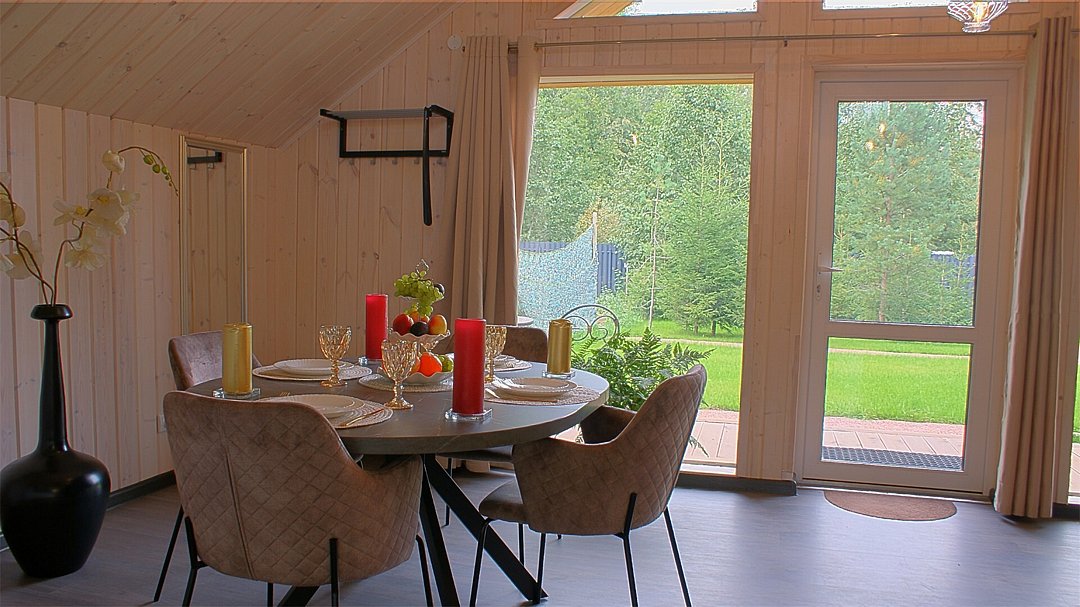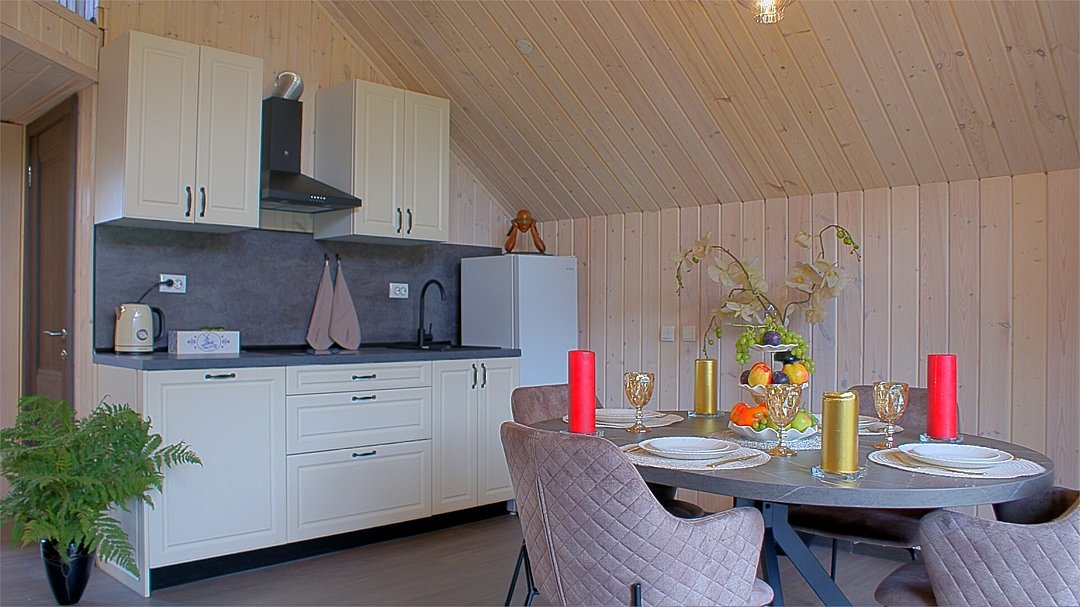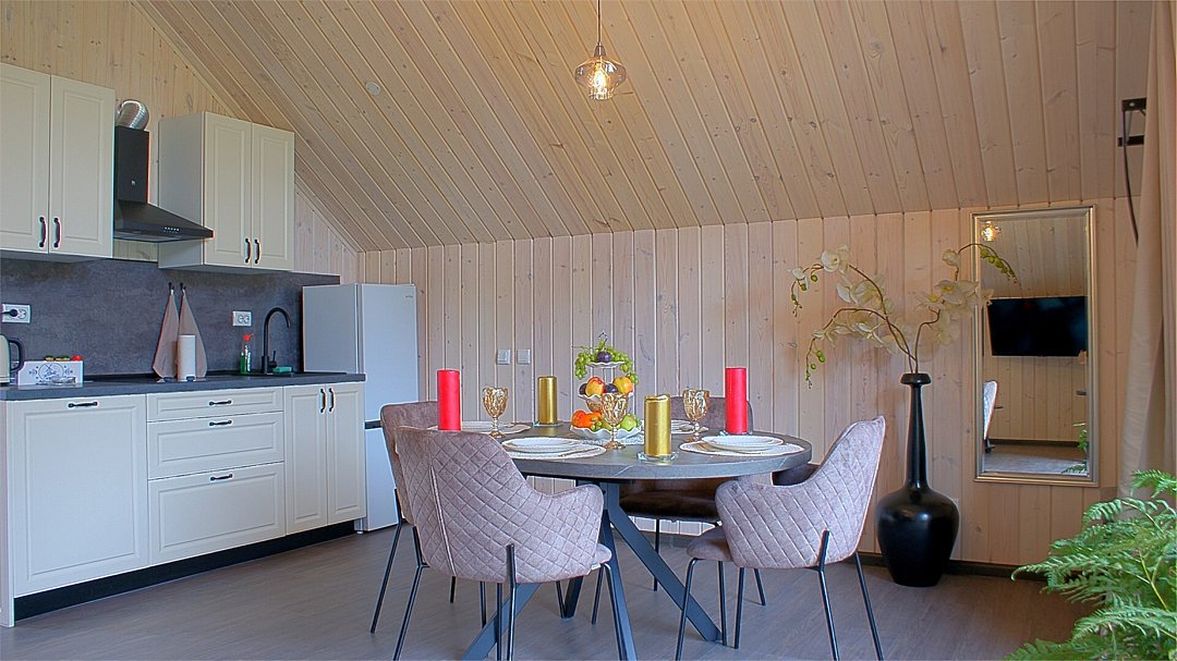 Данный дом выполнен в спокойных тонах классического стиля. В нём гости могут ощутить комфорт и приятную атмосферу светлого и просторного интерьера. Выбеленные стены и мебель вместе с панорамными окнами значительно увеличивают пространство и придают ощущение свободы. На первом этаже находятся кухня-гостиная с двухместным раскладным диваном, а также санузел и спальня. Вторая спальня расположена на мансардном этаже.