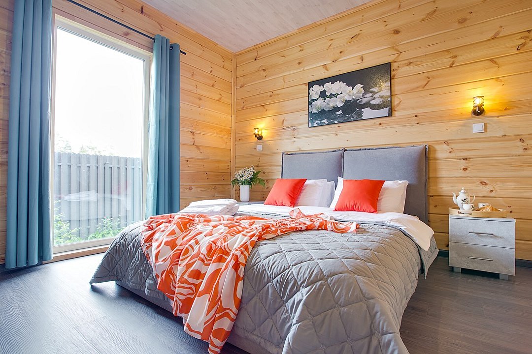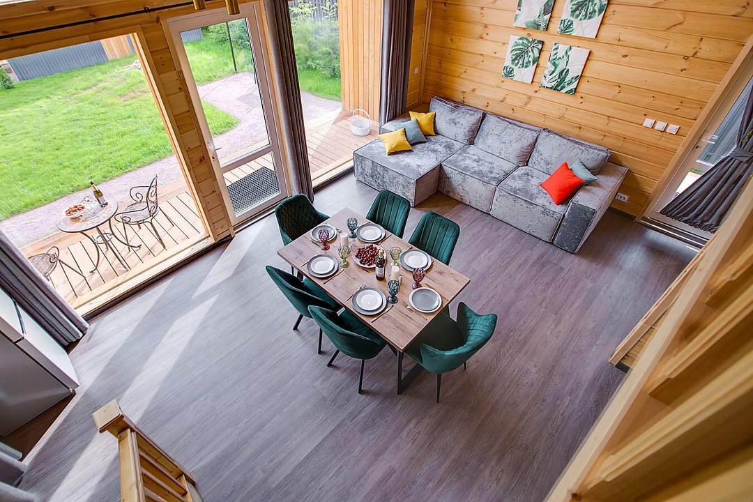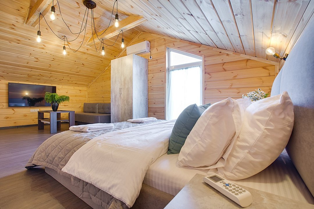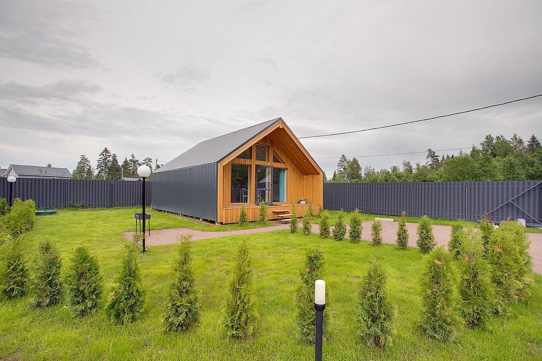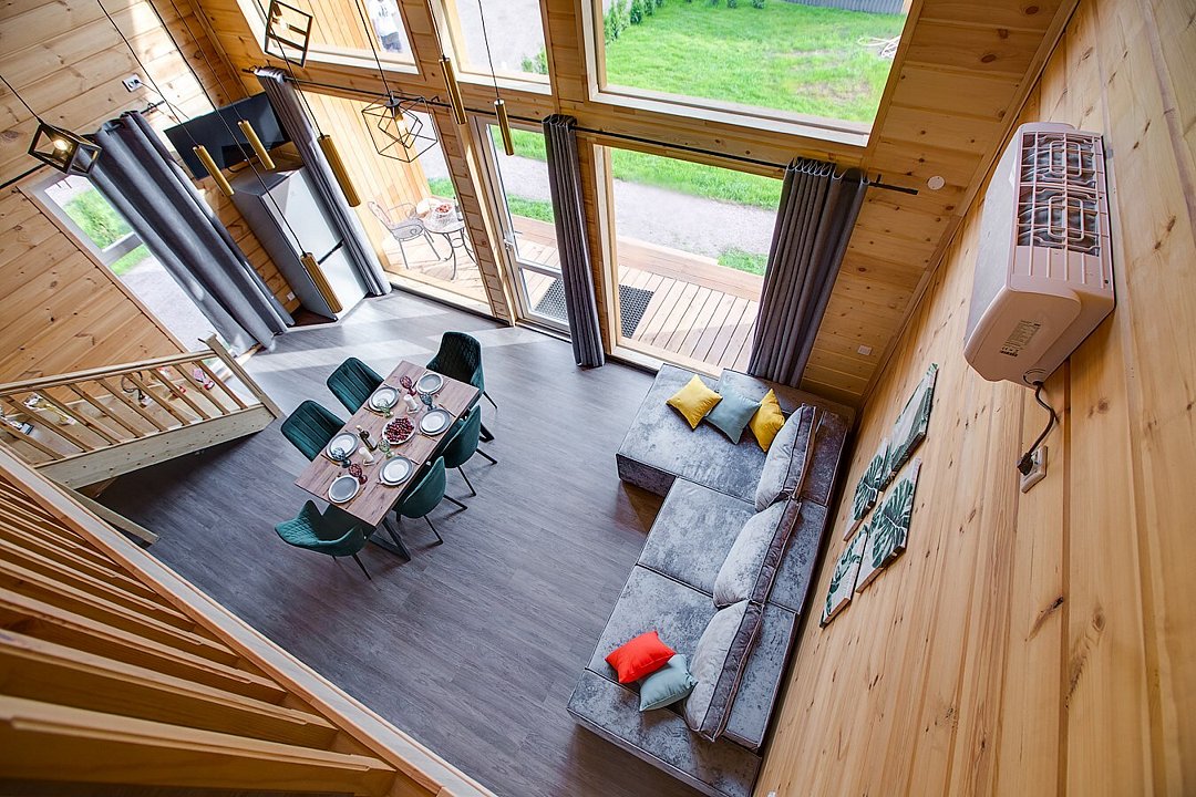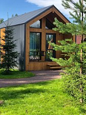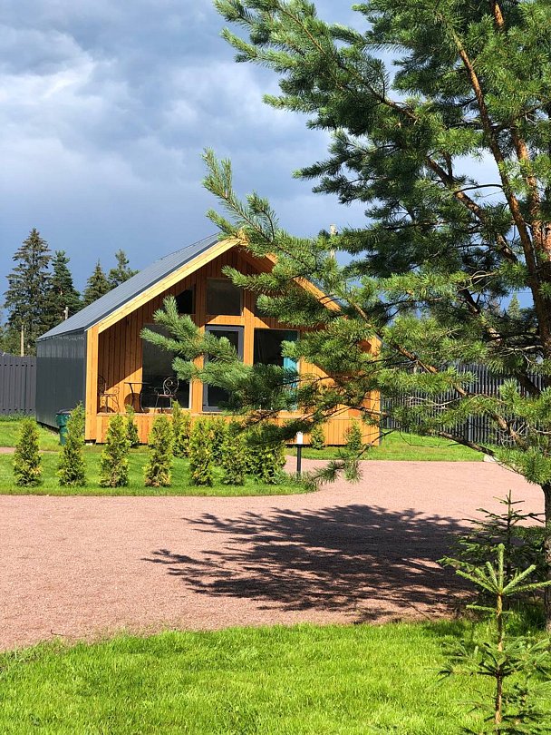 Замечательный двухэтажный дом построен по технологии Барн-Хаус. Это позволяет гостям ощутить весь комфорт и уют за счёт панорамных окон, второго света и просторных комнат. На первом этаже находятся кухня-гостиная с двухместным раскладным диваном, а также санузел и спальня. Второй же этаж располагает большой спальней с кроватью и раскладным диваном. Дом вмещает до 8 человек.