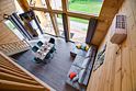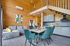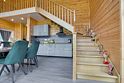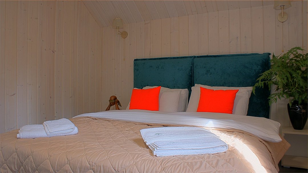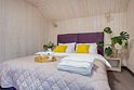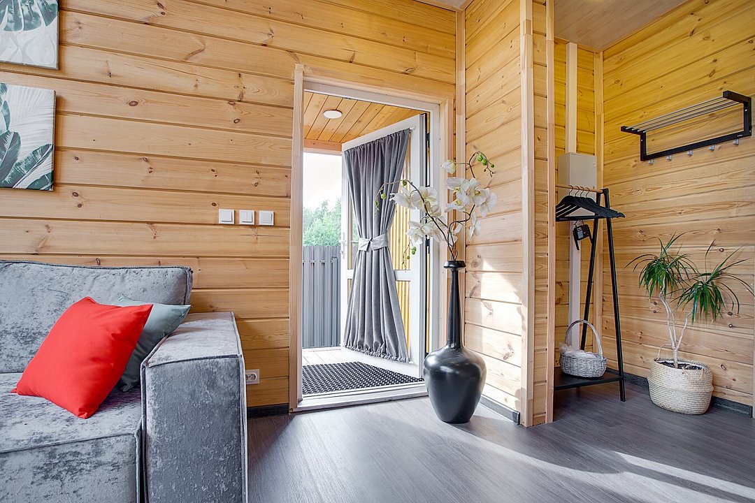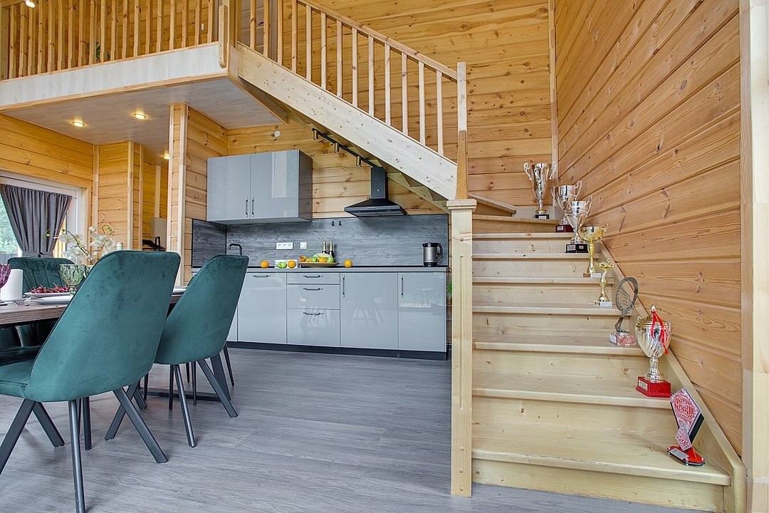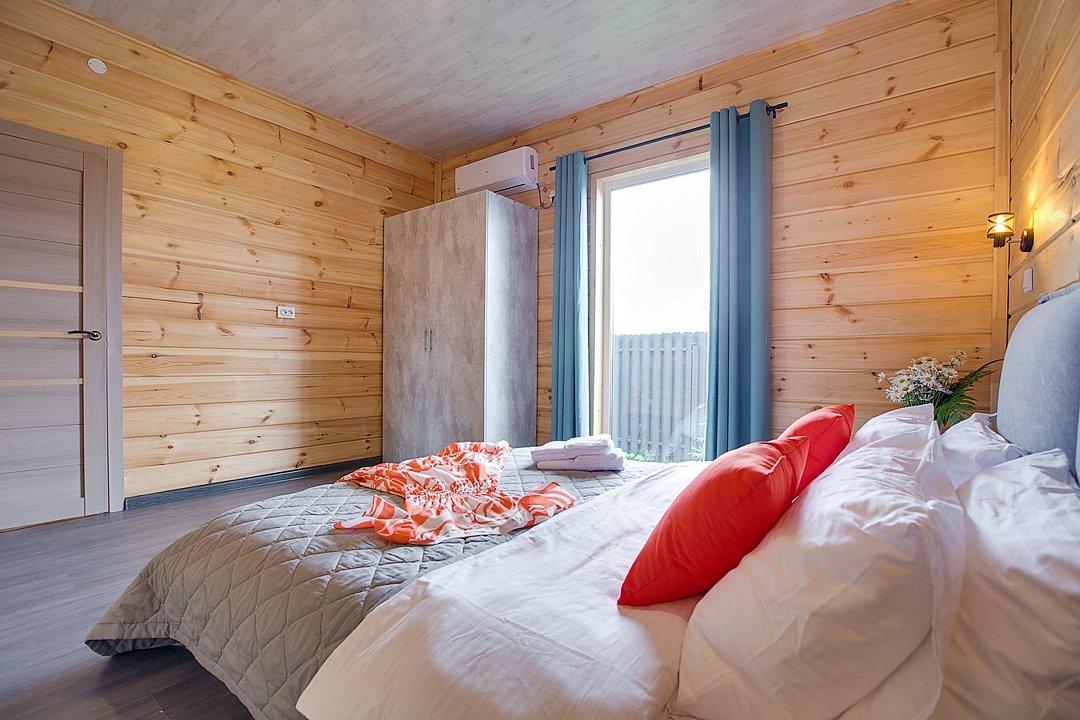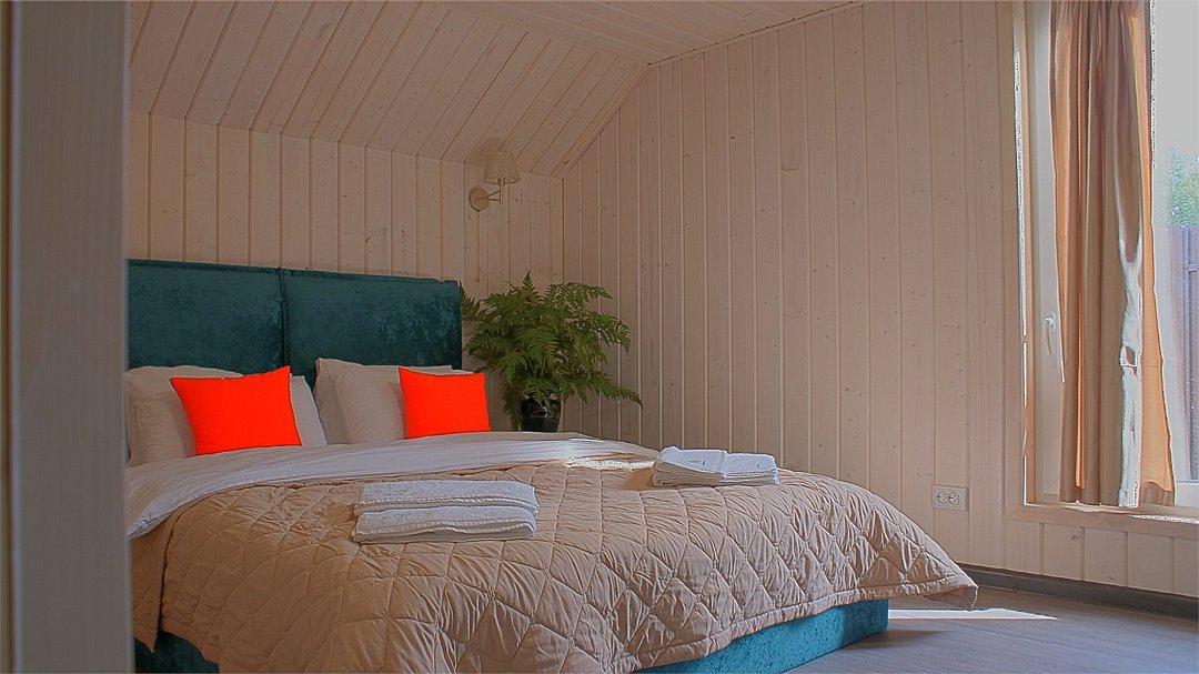 Замечательный двухэтажный дом построен по технологии Барн-Хаус. Это позволяет гостям ощутить весь комфорт и уют за счёт панорамных окон, второго света и просторных комнат. На первом этаже находятся кухня-гостиная с двухместным раскладным диваном, а также санузел и спальня. Второй же этаж располагает большой спальней с кроватью и раскладным диваном. Дом вмещает до 8 человек.