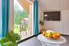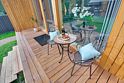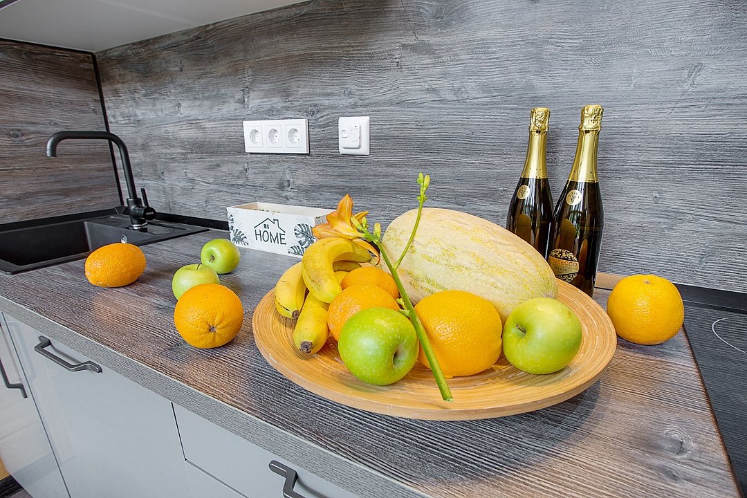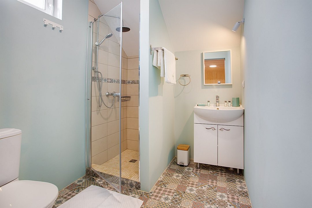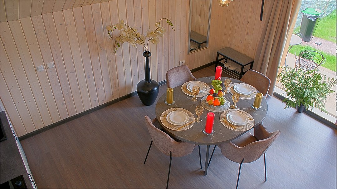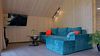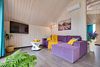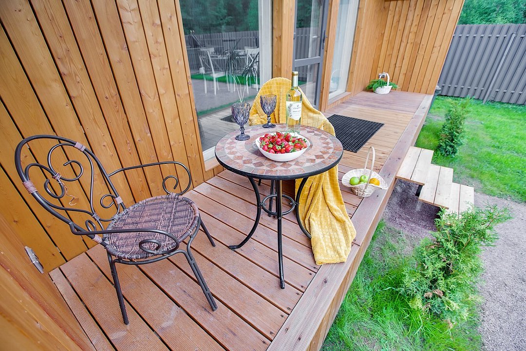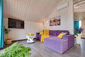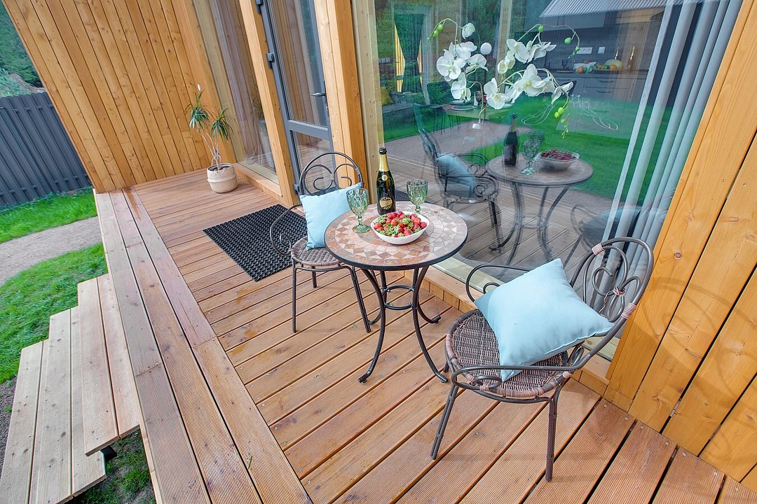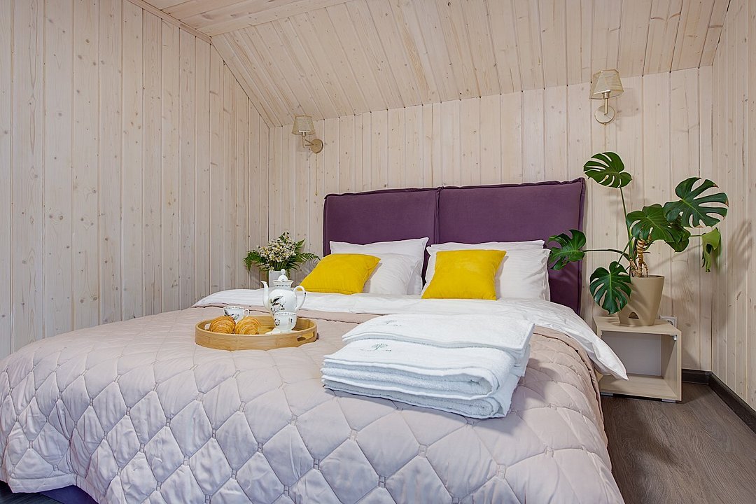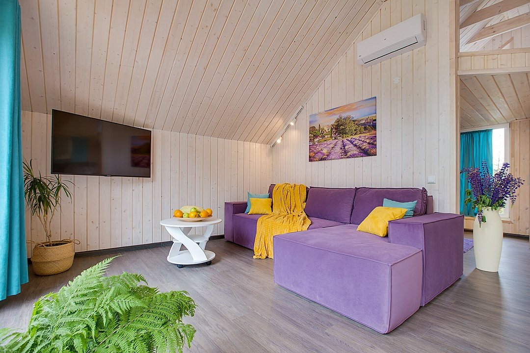 Данный дом выполнен в ярких цветах стиля прованс. В нём гости могут ощутить комфорт и приятную атмосферу светлого и красочного интерьера. Выбеленные стены и мебель вместе с панорамными окнами значительно увеличивают пространство и придают ощущение свободы. На первом этаже находятся кухня-гостиная с двухместным раскладным диваном, а также санузел и спальня. Вторая спальня расположена на мансардном этаже.