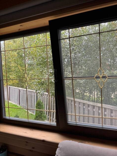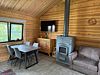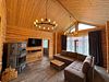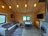 Большая гостиная с витражными окнами, дровяным камином Tulikiwi и мягкой ТВ-зоной для вашего отдыха.