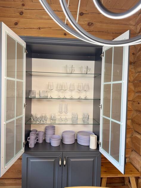 Кухня-столовая с обеденной группой из массива дерева на 6 персон, столовым буфетом с элегантной посудой для сервировки вашего стола и полностью оборудованной кухней. Кухня оборудована большим двустворчатым холодильником, духовым шкафом, плитой, посудомоечной машиной, микроволновой печью и всеми необходимыми мелкими бытовыми приборами, кастрюлями и сковородами для приготовления пищи.