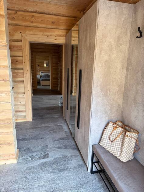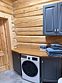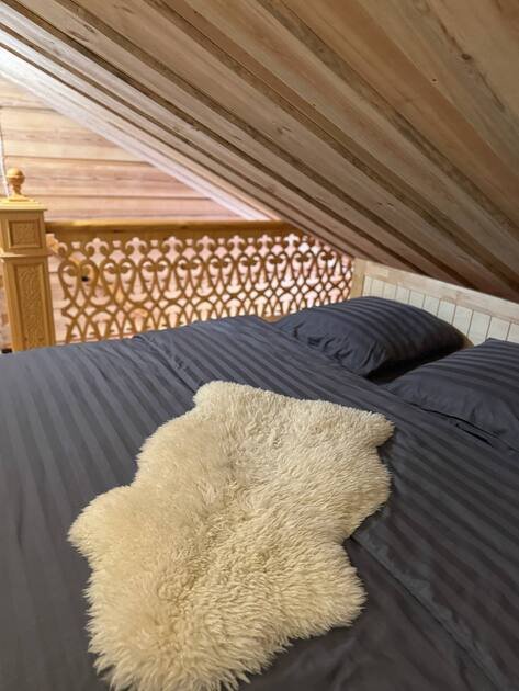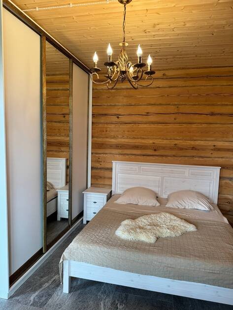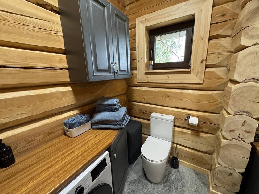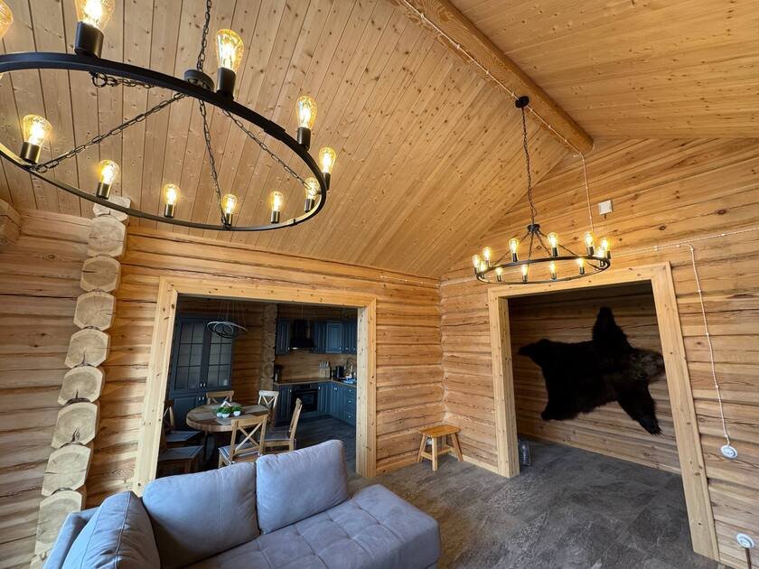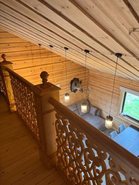 - сруб из лафета, камин из талькомагнезита, просторная финская сауна , дизайнерская мебель из массива и множество деталей ручной работы из натурального дерева.