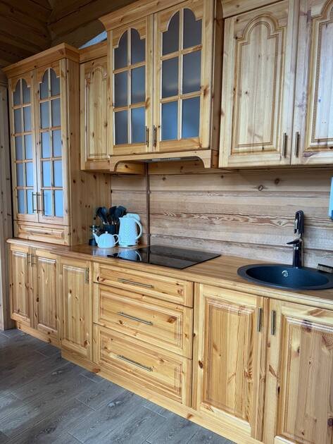 - сруб из лафета, камин из талькомагнезита, просторная финская сауна, дизайнерская мебель из массива и множество деталей тонкой ручной работы из натурального дерева.