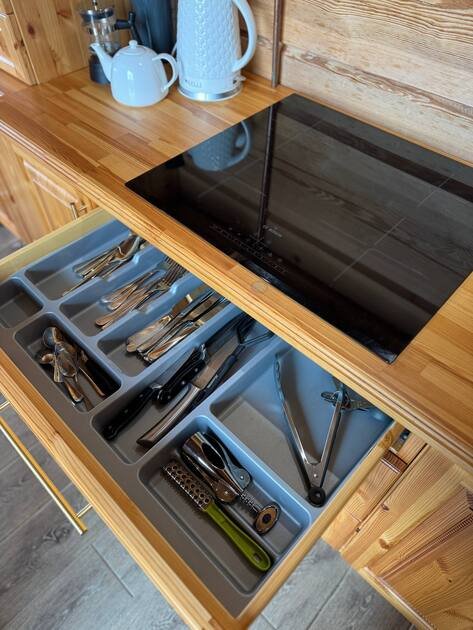 Кухня-столовая с обеденной группой на 4 персоны, посудой для сервировки вашего стола и полностью оборудованной кухней.