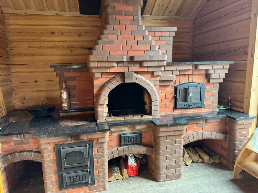 Эксклюзивной особенностью дома является большой мангальный комплекс из кирпича с мангалом, русской печью, плитой и отдельной кухней-столовой.
