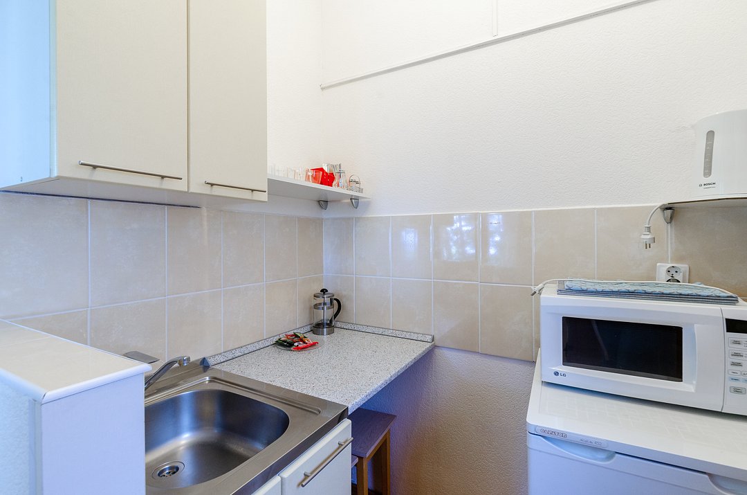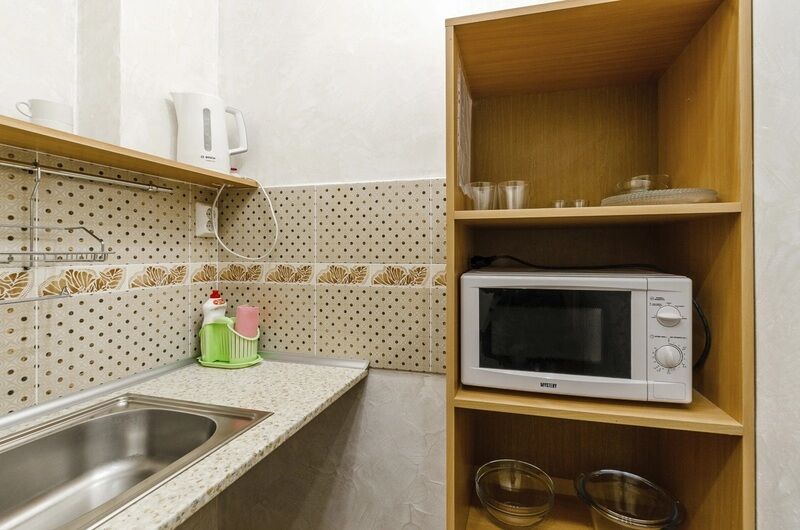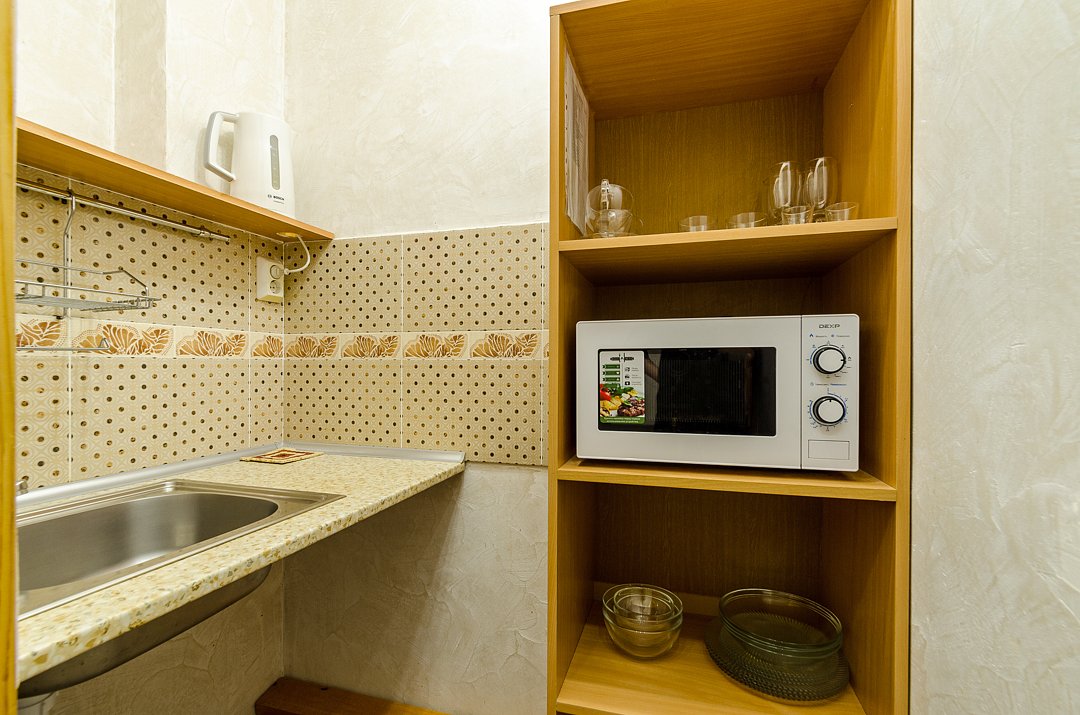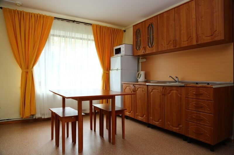 На 3 этаже первого корпуса есть общая кухня с кухонным гарнитуром, варочной поверхностью, микроволновкой, чайником и кулером с питьевой водой. Посуду и приборы можно взять бесплатно у администратора отеля.
