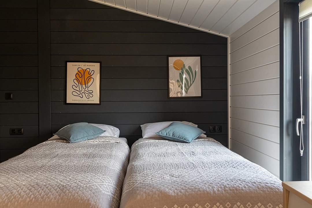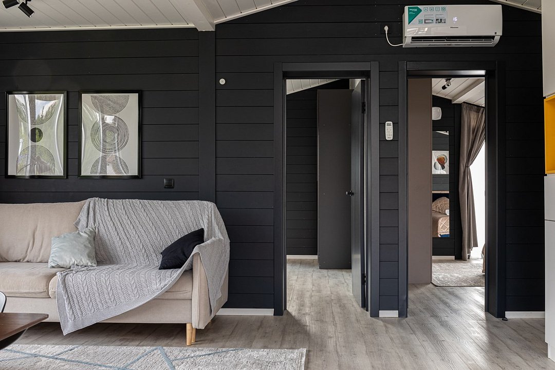 Фьюжн — яркий и стильный дом, оборудованный всем необходимым для проживания. Дом располагает двумя спальнями, одной ванной комнатой с душем, индивидуальной террасой мангальной зоной, панорамными окнами. В гостиной — функциональная кухня, обеденная зона, зона отдыха с диваном. Интерьер выполнен в современном стиле. Экологичные материалы в отделке, натуральные фактуры в каждом элементе декора и светлые тона в интерьере дополняют ощущение единения с природой. Во всех комнатах встроены теплые полы, воссоздающие теплую атмосферу домашнего уюта.