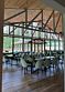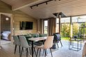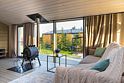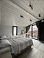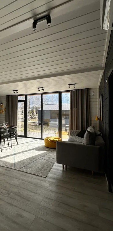 Панорамные окна в пол с видом на лесной массив создают атмосферу тишины и спокойствия, что делает отдых особенно приятным.