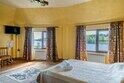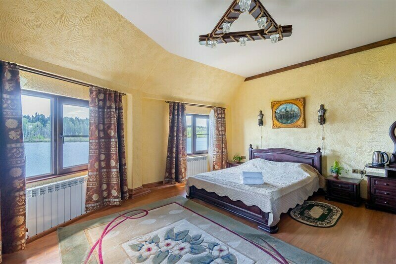 В центральном здании на втором этаже номер со всеми удобствами (24 кв.м) с окнами с видом на озеро. В номере спальный гарнитур из массива дерева вишня- двуспальная кровать, шкаф, прикроватные тумбочки, трюмо, диван кровать. Сан узел совмещенный с душевой кабиной.