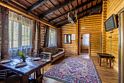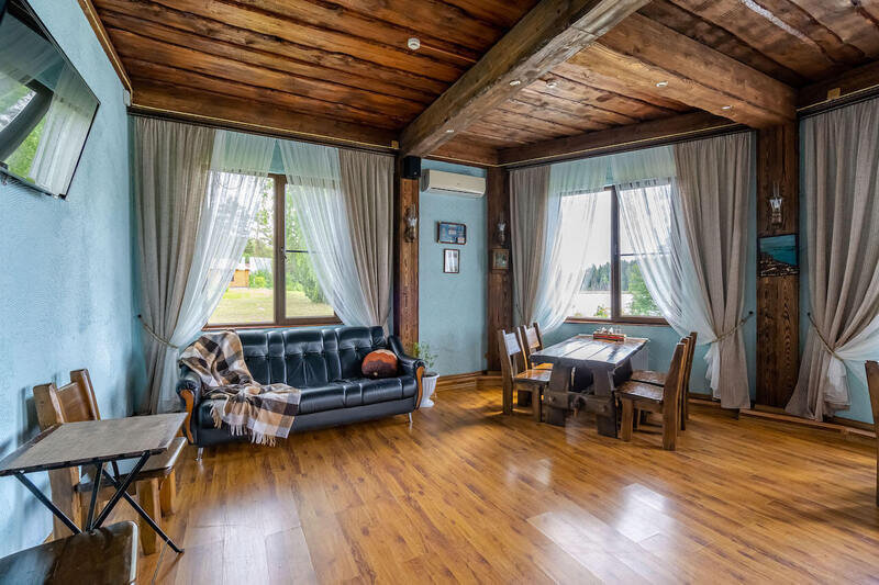Коттедж в стиле шале с высокими потолками и потолочными балками. Имеются две спальни, в каждой из которых 2-х спальная кровать из массива дерева ручной работы с росписями у изголовья. В гостиной 2-х спальный диван, смарт ТВ, Wi-Fi. В кухонной зоне обеденный стол со стульями, кухонный гарнитур, холодильник, микроволновая печь, чайник, посуда.