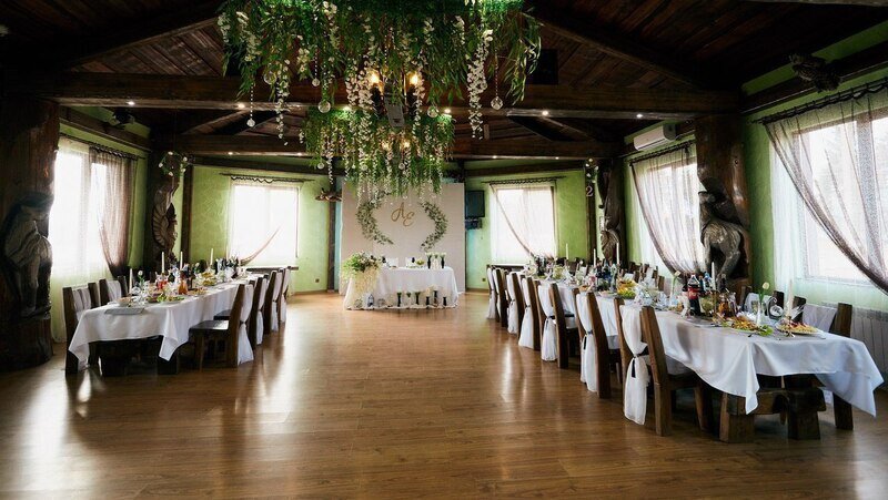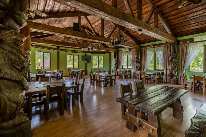 Банкетный зал имеет лесной дизайн: отделка потолка выполнена из настоящего бруса, вдоль стен расставлены фигуры резных животных. Люстры также ручной работы.Лесной трактир