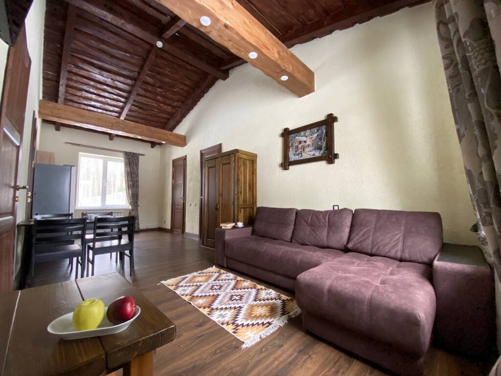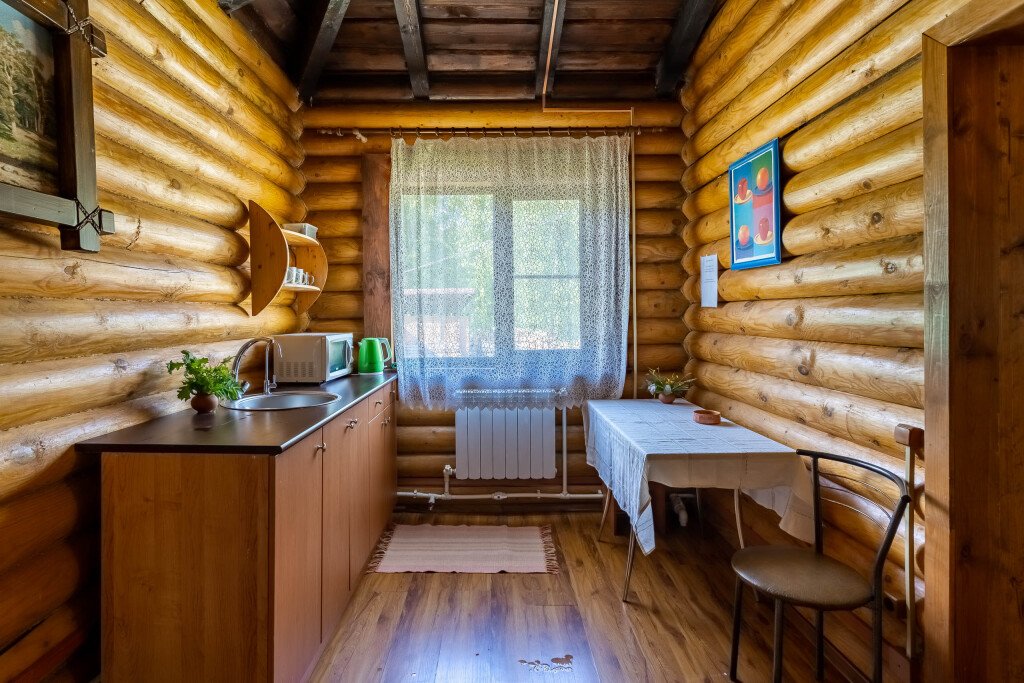 Гостевой дом из бруса со всеми удобствами, состоящий из двух спален, гостиной, кухни, сан узлом. Оснащен мебелью из массива дерева, ЖКТ телевизором 20 каналов, душевой кабиной, современной сантехникой и мебелью из массива дерева. В одной спальне двуспальная кровать во второй две односпальные кровати. В гостиной диван кровать с обеденным столом. Кухня оснащена холодильником, микроволновой печью, посудой. Горячая и холодная вода подается круглосуточно. У дома установлен беседка с мангалам и качелями.