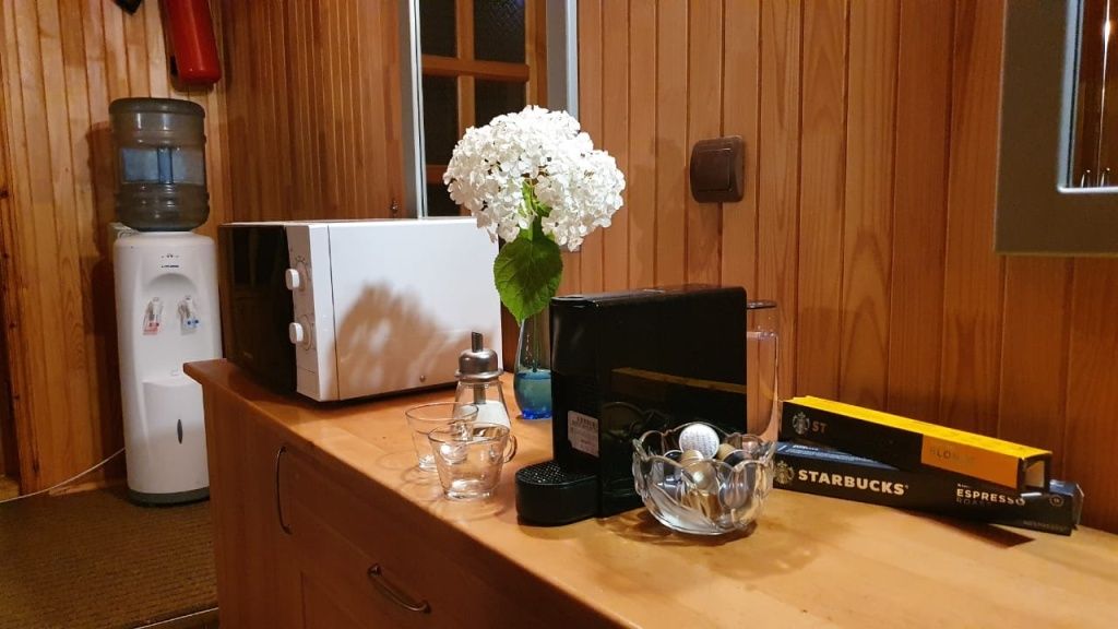 На первом этаже дома расположены: просторная гостиная с большим диваном и телевизором 70”, кухня с индукционной плитой, микроволновой печью, холодильником и всей необходимой посудой, кофейный уголок с кофемашиной Nespresso, чайником и принадлежностями для приготовления чая и кофе, а также туалетная комната.