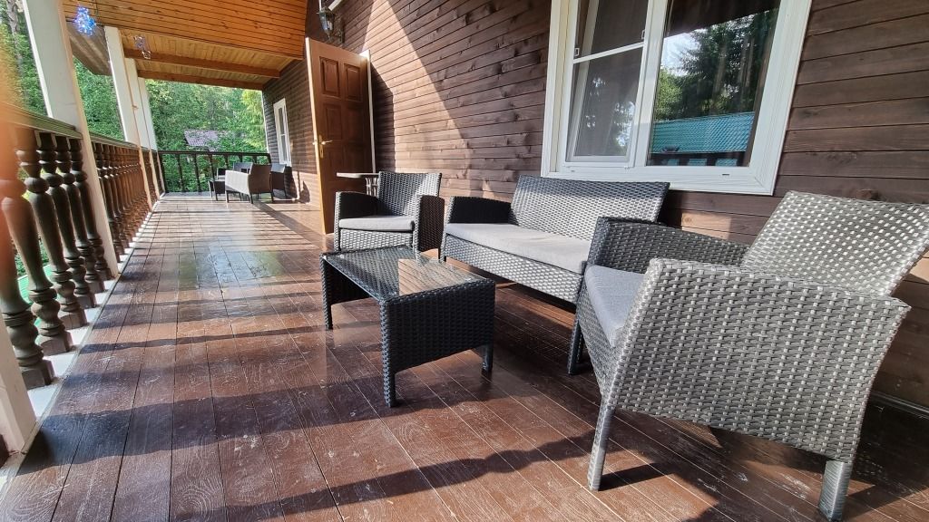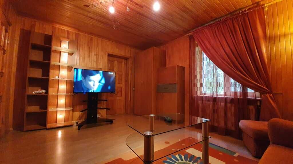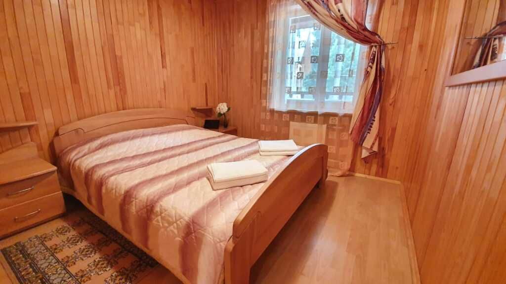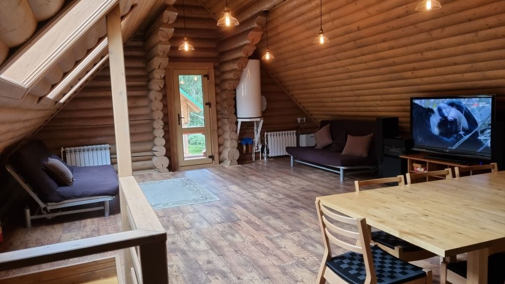 В доме 4 раскладных дивана, телевизор диагональю 55 дюймов, триколор тв, холодильник, чайник (чай, сахар в свободном доступе), столовые приборы, посуда. В «Теремке» есть сауна и хамам. Они в стоимость номера не входят и заказываются отдельно.