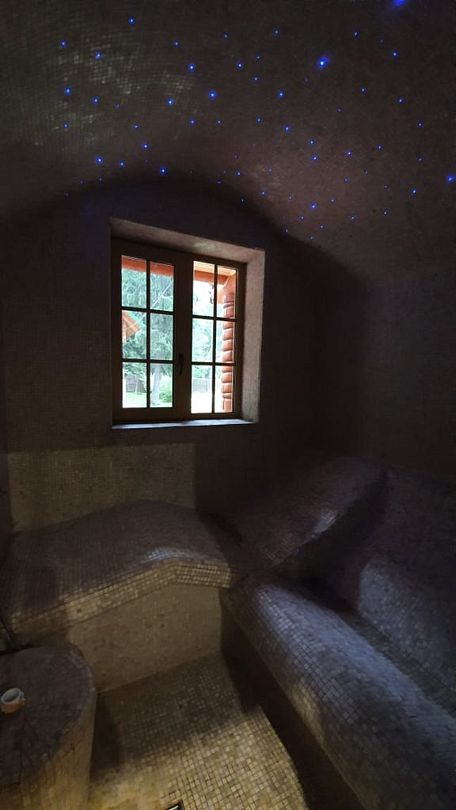 В доме 4 раскладных дивана, телевизор диагональю 55 дюймов, триколор тв, холодильник, чайник (чай, сахар в свободном доступе), столовые приборы, посуда. Есть сауна и хаммам. Они в стоимость номера не входят и заказываются отдельно.