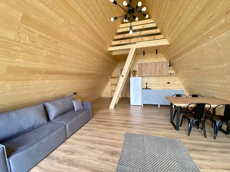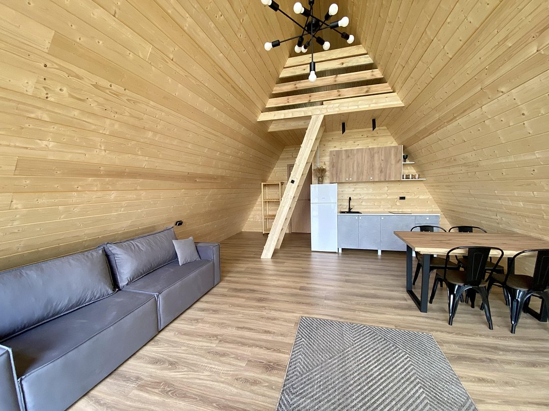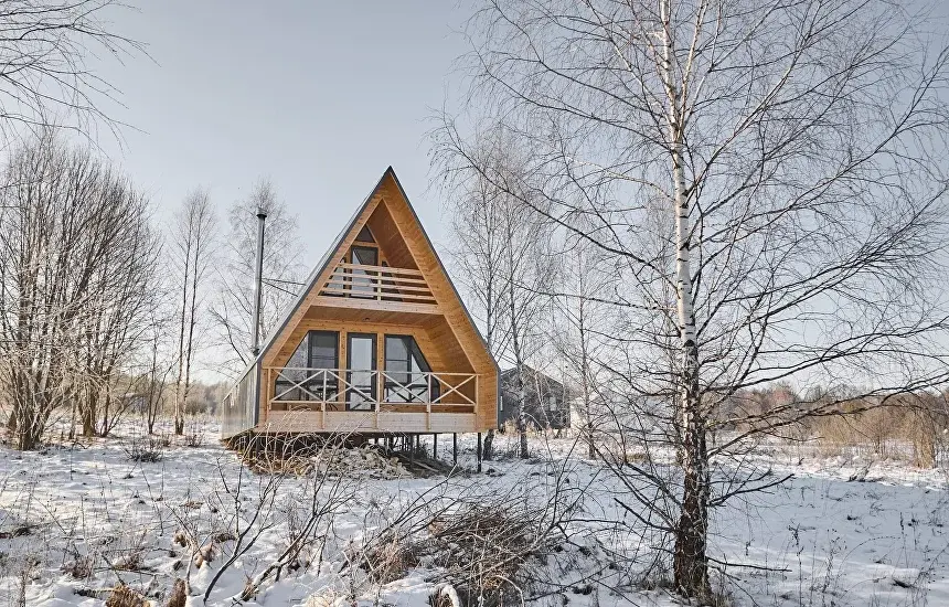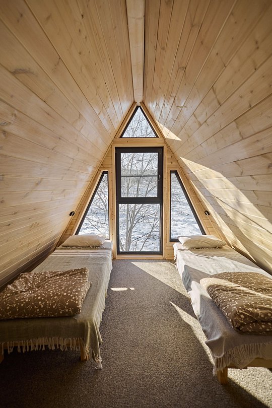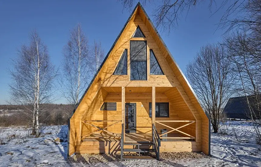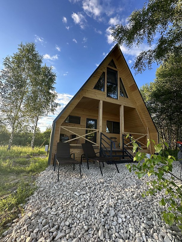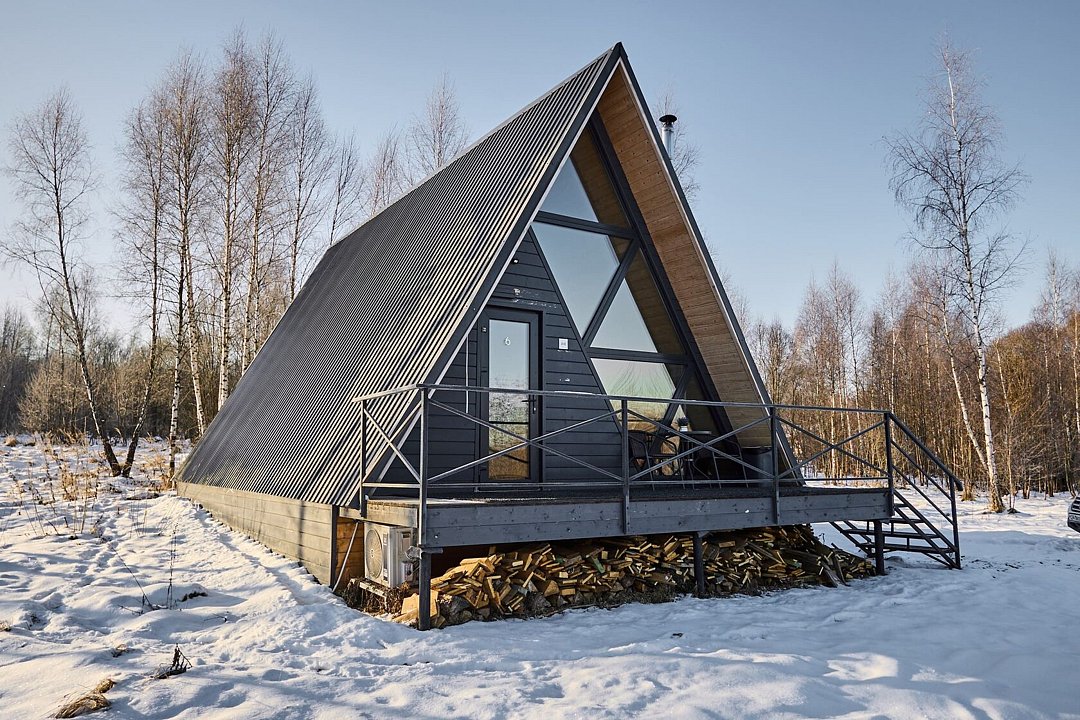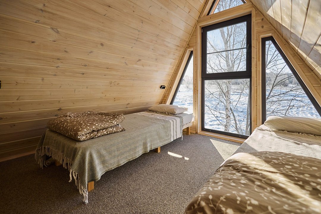 А-фрейм — это самые вместительные домики на всей территории глэмпинга. Они могут разместить одновременно до 6 человек с комфортом