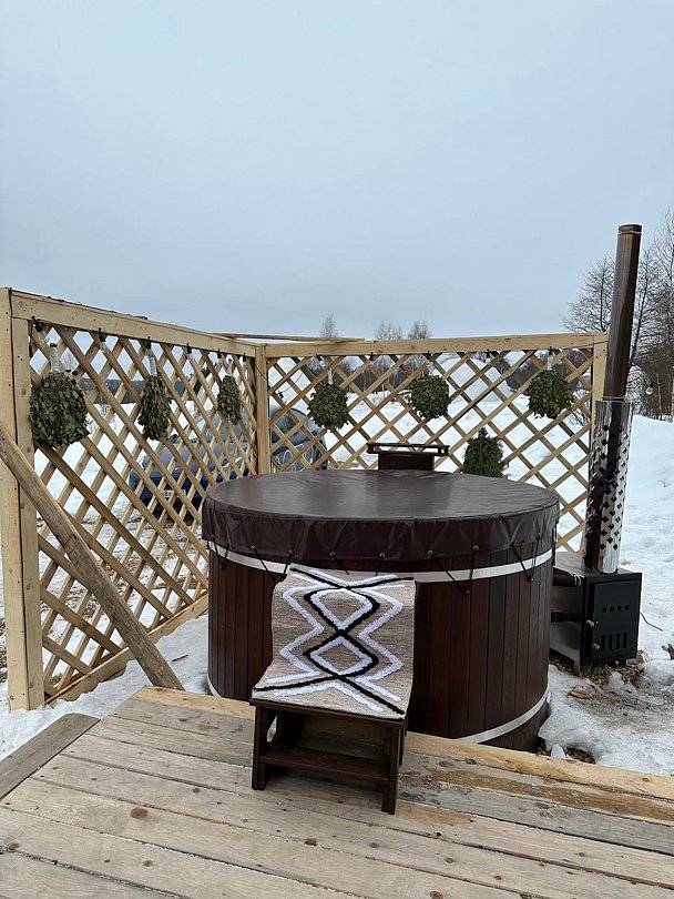 - Терраса с видом и банным чаном: Завораживающие пейзажи, которые открываются с террасы, создают атмосферу уюта и гармонии. Встречайте рассветы, провожайте закаты и наслаждайтесь каждым мгновением. А чтобы ваш отдых стал ещё более особенным, на террасе вас ждёт собственный банный чан.