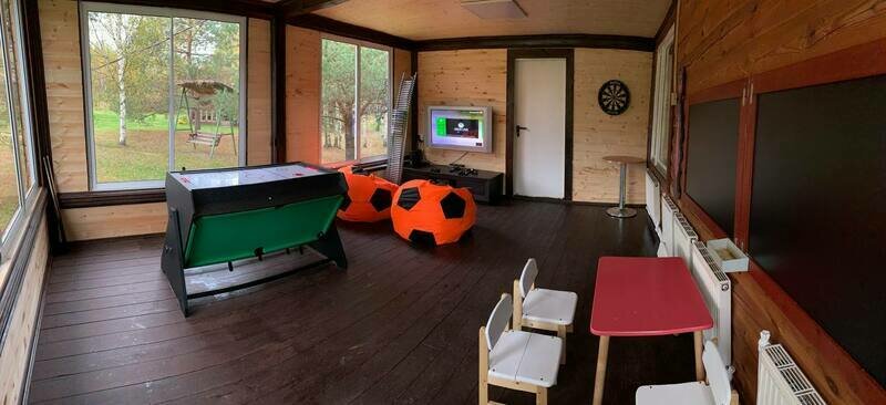 Две спальни, большая гостиная с большим удобным диваном, телевизором и обеденным столом, совмещенная с кухней (холодильник, чайник, микроволновая печь), санузел, большая веранда с садовой мебелью, мангал.