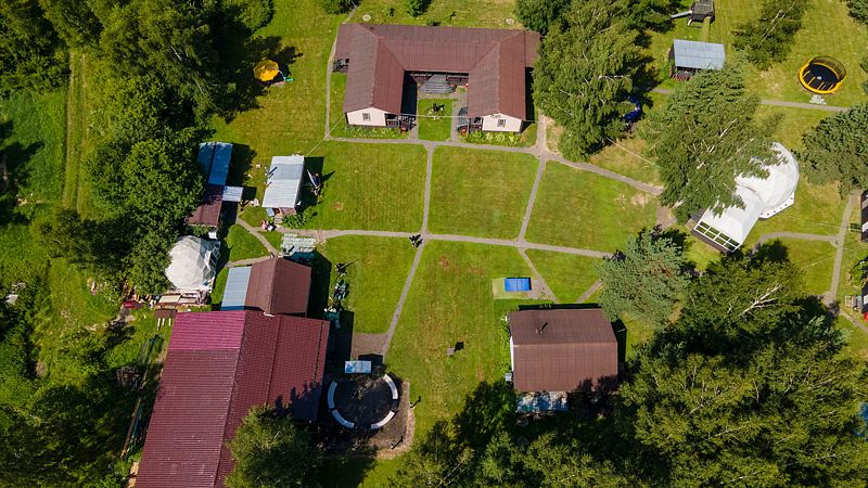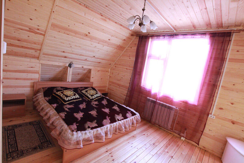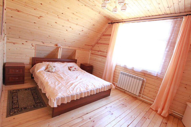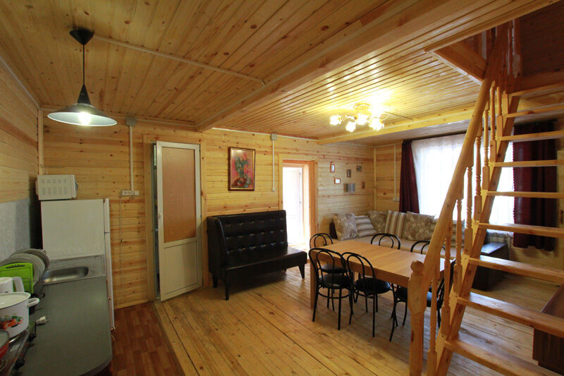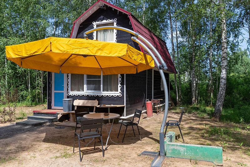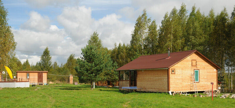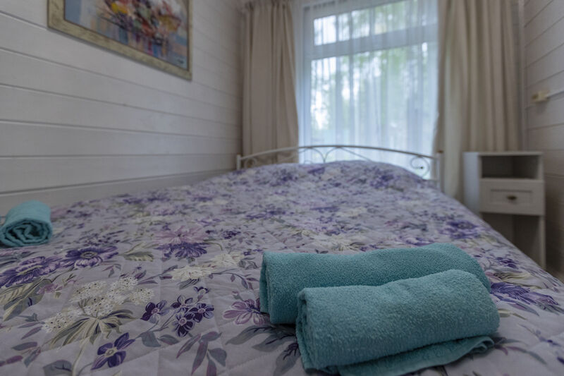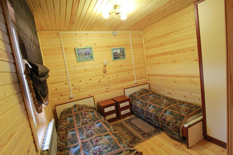 На территории расположены 2 двухэтажных коттеджа площадью по 100 м2. Комфортное размещение для 8 человек, максимальное для 10. Есть возможность для двух дополнительных мест (за отдельную плату). На первом этаже санузел, прихожая, гостинная (раскладывающийся диван, телевизор, обеденный стол), совмещенная с кухней (электрическая плита, холодильник, микроволновая печь, чайник, необходимая посуда), две спальни (односпальные кровати, шкафы, тумбы). На втором этаже две просторных спальни (двуспальные кровати, тумбы, пуф, зеркало). У каждого коттеджа есть веранда с садовой мебелью и местом для мангала.