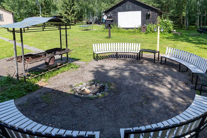 У коттеджа мангальная зона с мангалом.