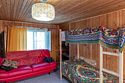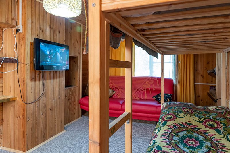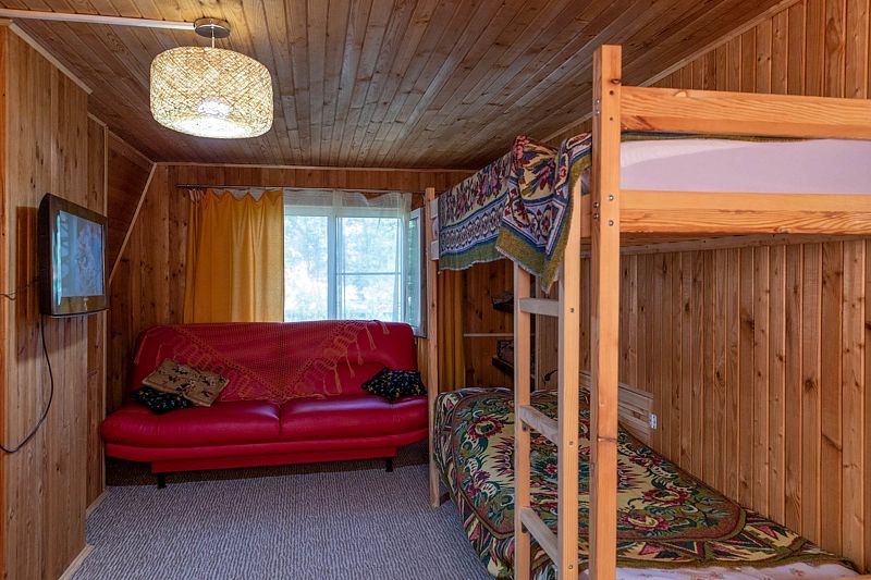 На втором этаже большой зал с двухспальной и двухъярусной кроватями, небольшой диван, телевизор , шкафы и полки для одежды.