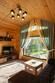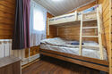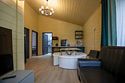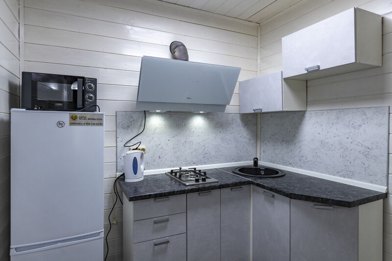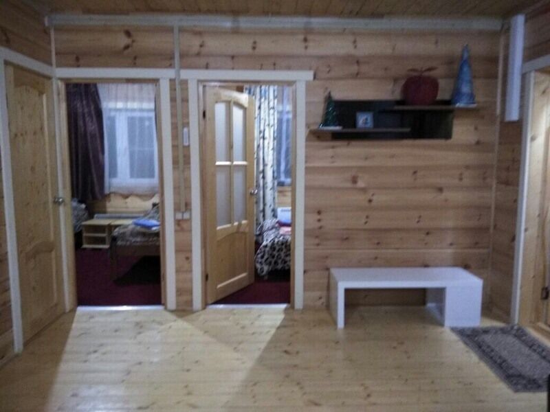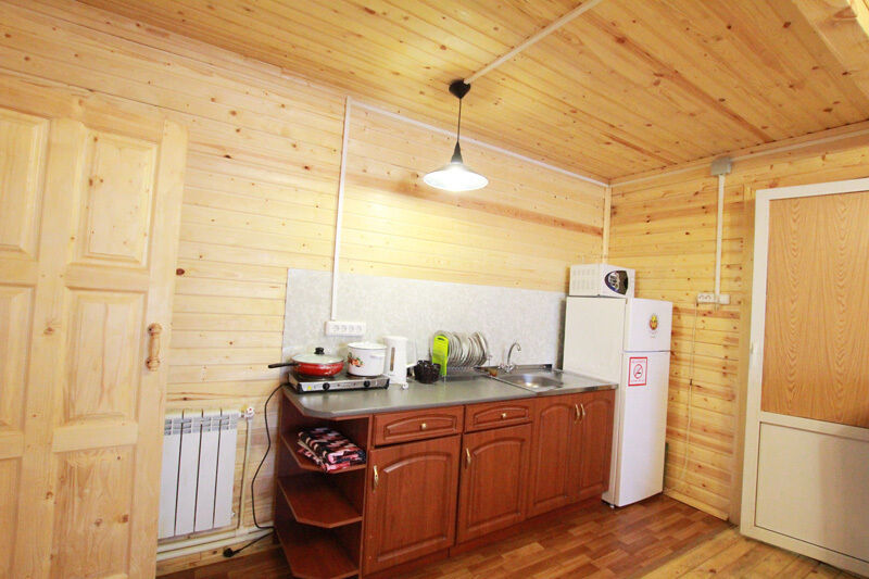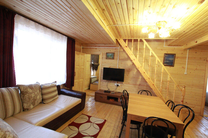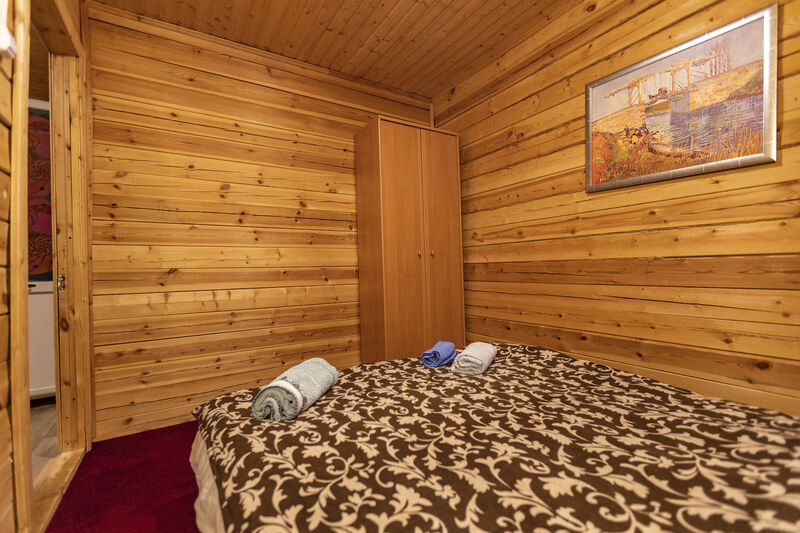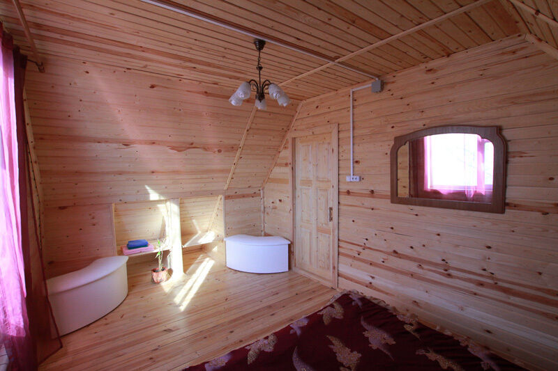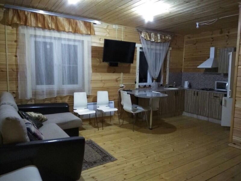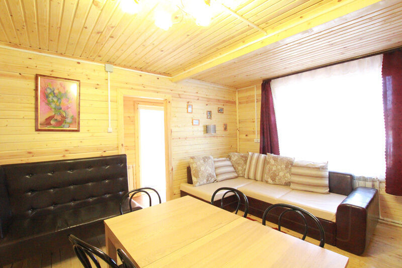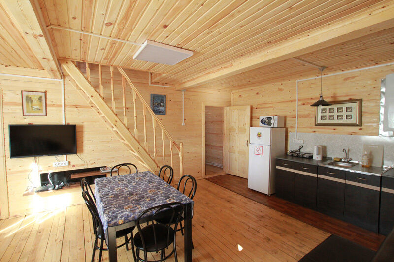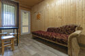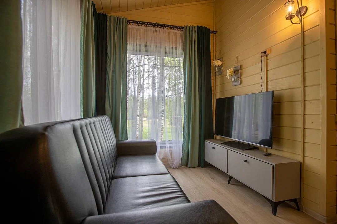 В коттедже санузел, прихожая, гостиная (раскладывающийся диван, телевизор, обеденный стол), совмещенная с кухней — (электрическая плита, холодильник, микроволновая печь, чайник, необходимая посуда), спальня (на выбор односпальные или двуспальные кровати, шкафы, тумбы).