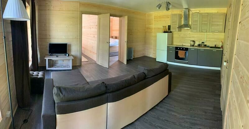 Две спальни, просторная гостиная с большим удобным диваном, телевизором и обеденным столом, совмещенная с кухней (холодильник, чайник, микроволновая печь, плита), санузел, большая веранда с садовой мебелью, мангал.
