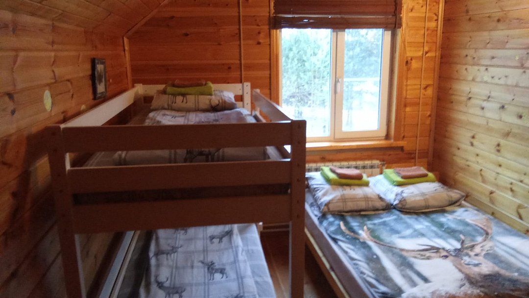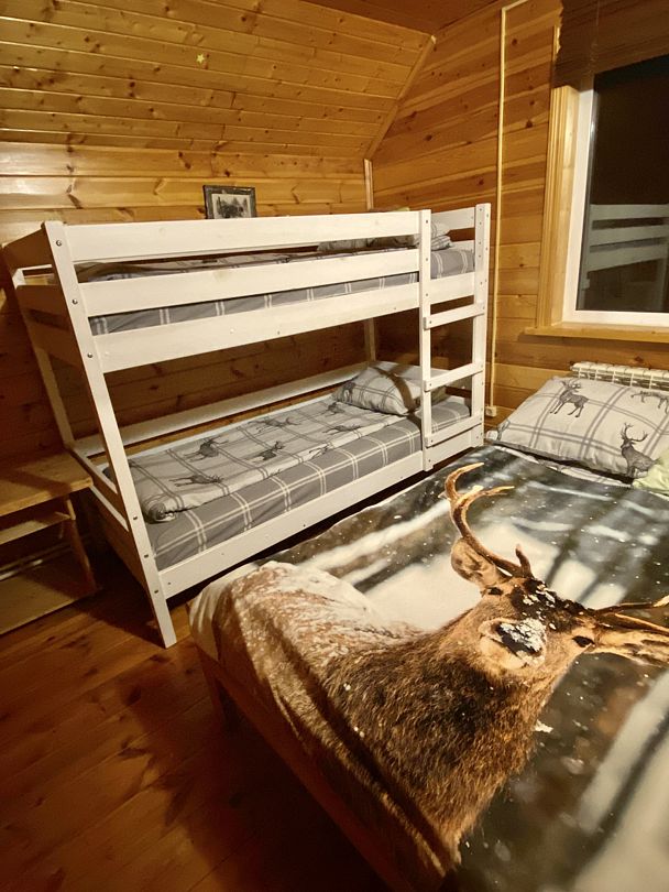 Отдельная комната в гостевом тереме на ферме с собственной ванной комнатой. Уютное постельное белье с оленями. Вид из окна на сосновый бор. Полное погружение в олений мир.