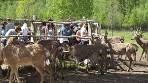 На прогулочной зоне: черкесские козлики, альпака — Афанасий, лама — Геннадий, семья ланей — Лёша, Лёва, Лина), марал — Мирослава, семья пятнистых оленей — Мишка, северный олень — Дымка, курочки.