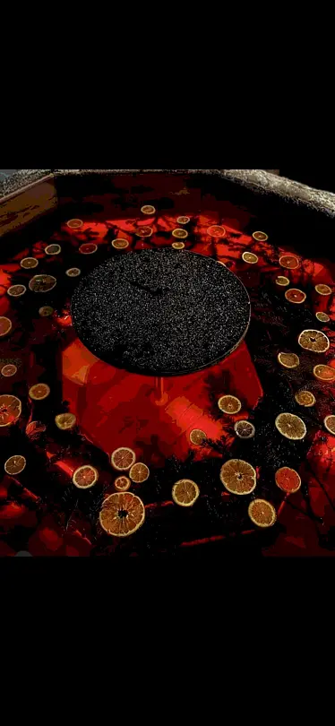 Чан с наполнением пихтовыми ветвями и дольками цитруса.