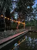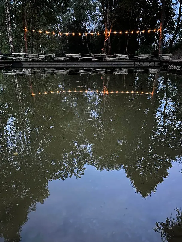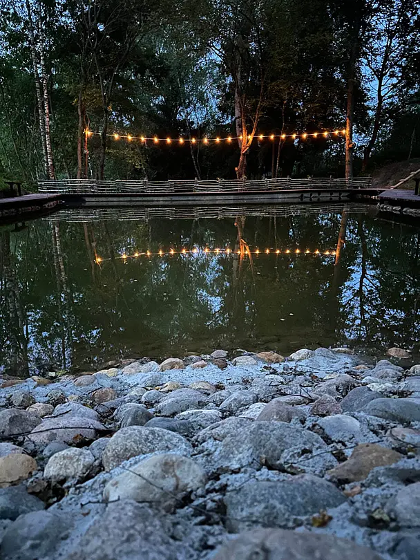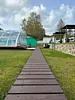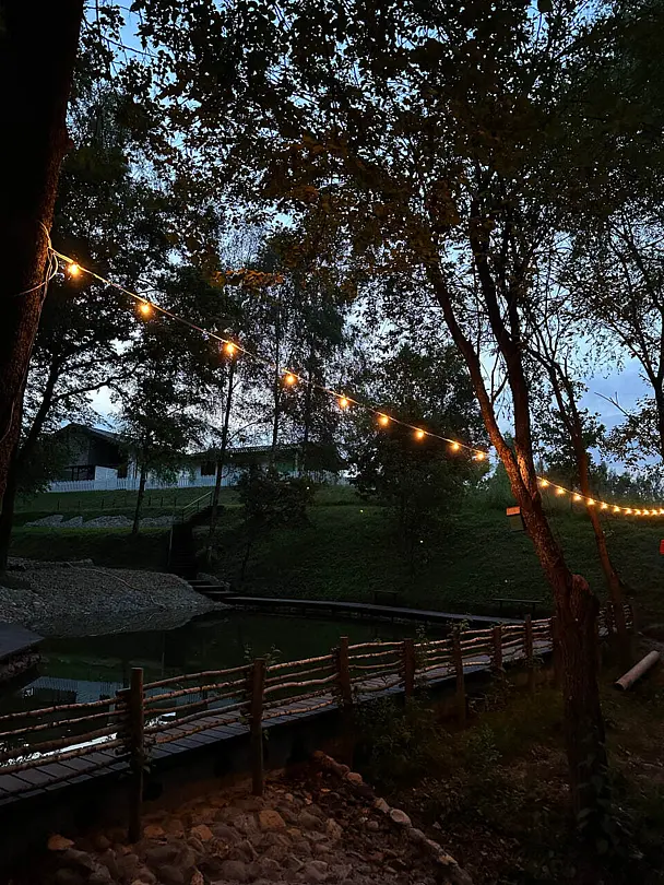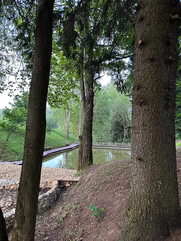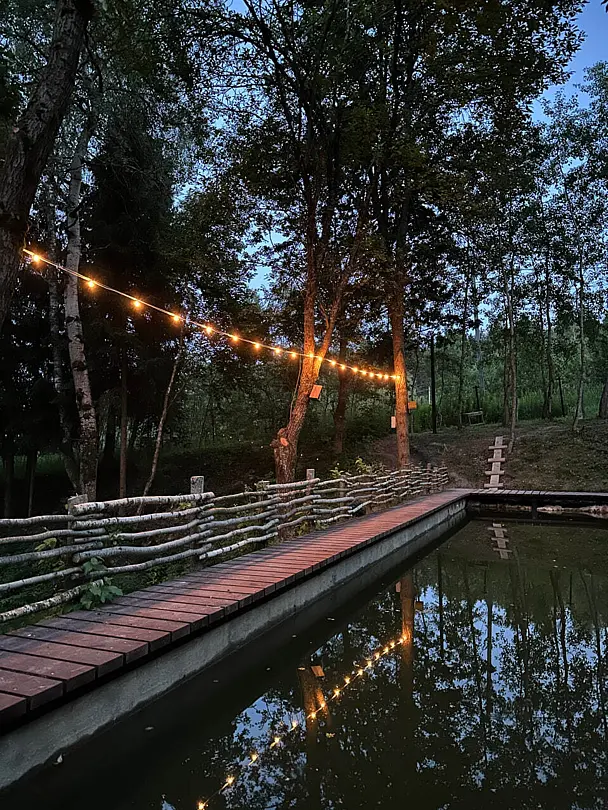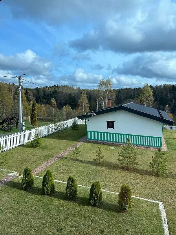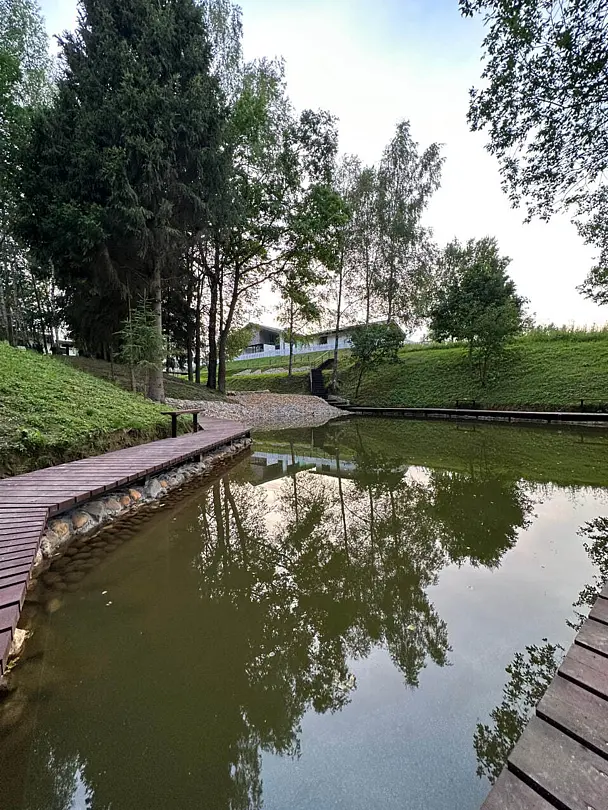 На территории расположен благоустроенный пруд и красивая парково-лесная зона, идеально подходящая для спокойного отдыха на природе. В пруду водится карп весом 1–1,5 кг и белый амур, для рыбалки предоставляется всё необходимое оборудование и принадлежности. На территории доступен просторный крытый бассейн с комфортной температурой воды 30–32 °C и глубиной 1,3 м, а рядом расположены уютные беседки-перголы.